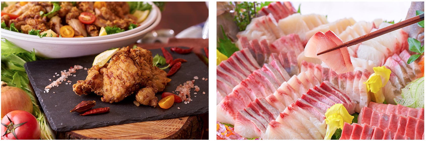 右:三重県、伊勢湾水揚げのかんぱちのお造りには、骨太な信州の地酒を合わせるのもお薦めです。産地表記証明書確認済みです。