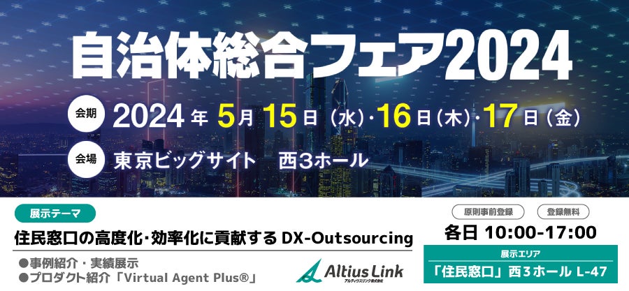 アルティウスリンク株式会社(所在地:東京都新宿区、代表取締役社長:網野 孝、以下 アルティウスリンク)は、2024年5月15日から17日の3日間、東京ビッグサイトで開催される「自治体総合フェア2024」に出展(ブース番号:西3ホール L-47)いたします。