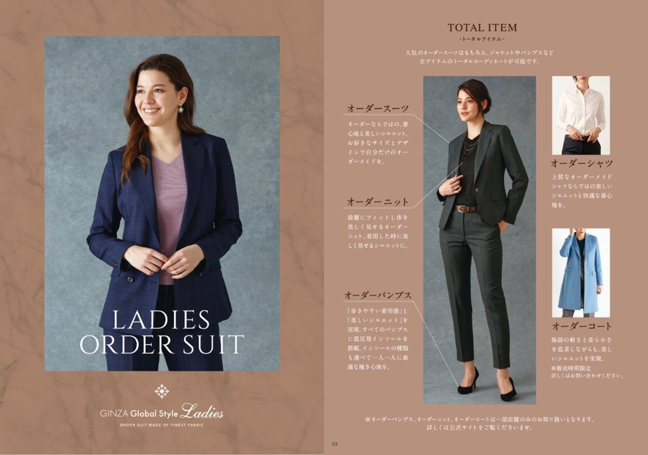 オーダースーツ専門店「GINZAグローバルスタイル」が新商品を追加した2025年最新版【レディースパンフレット】を公開!お好きなサイズとデザインで自分だけのオーダーメイドを。