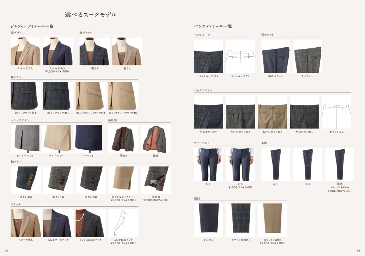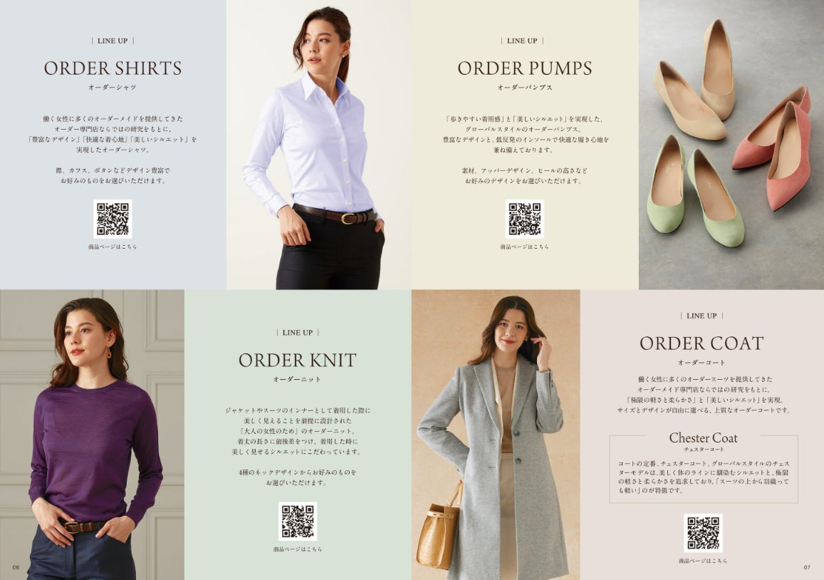 新しいパンフレットには、昨年新登場してから大好評の「レディースダブルジャケット」や、選べるスーツモデルなどについて詳しく掲載されています。また、コーディネートの画像も新作生地を使ったオーダースーツに更新いたしました。お客様のスタイルをより豊かにするアイテムを取り揃え、スーツ選びを一層楽しんでいただける内容となっています。