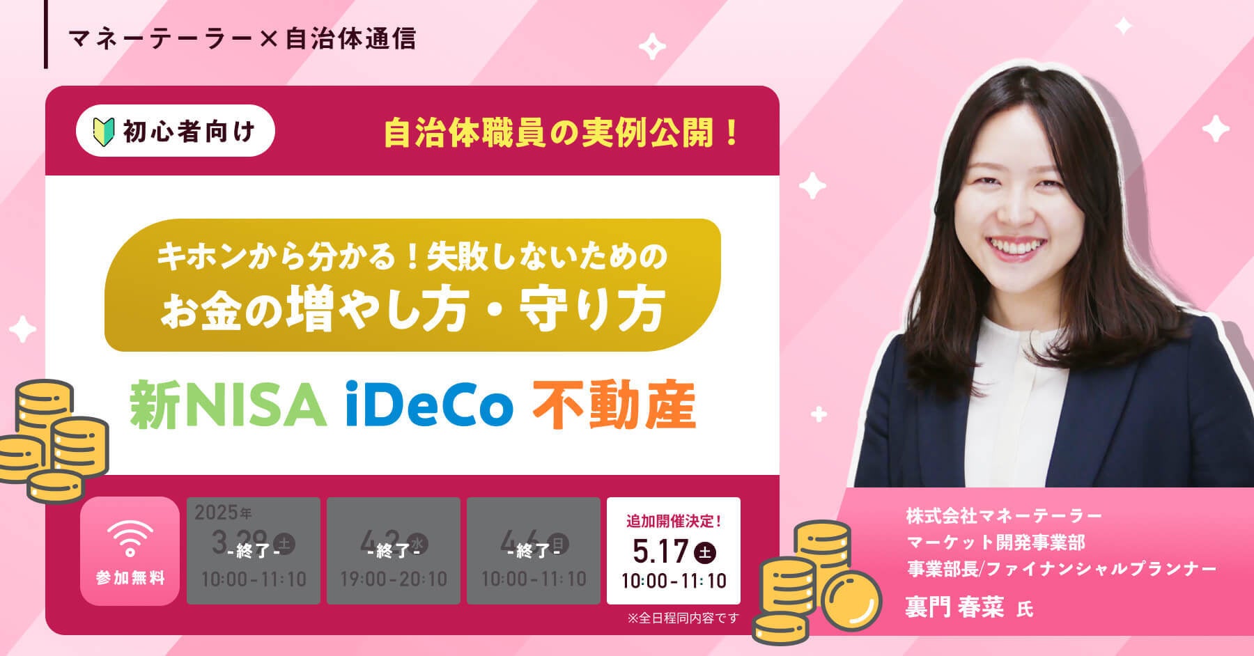 【追加開催決定!】マネーテーラー主催セミナー「【自治体職員の実例公開!】キホンから分かる!失敗しないためのお金の増やし方・守り方~新NISA・iDeCo・不動産~」