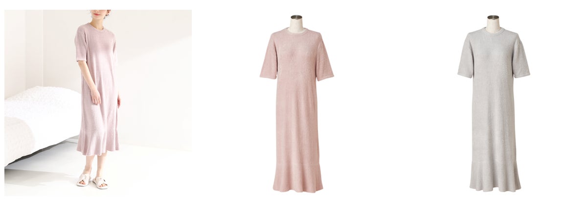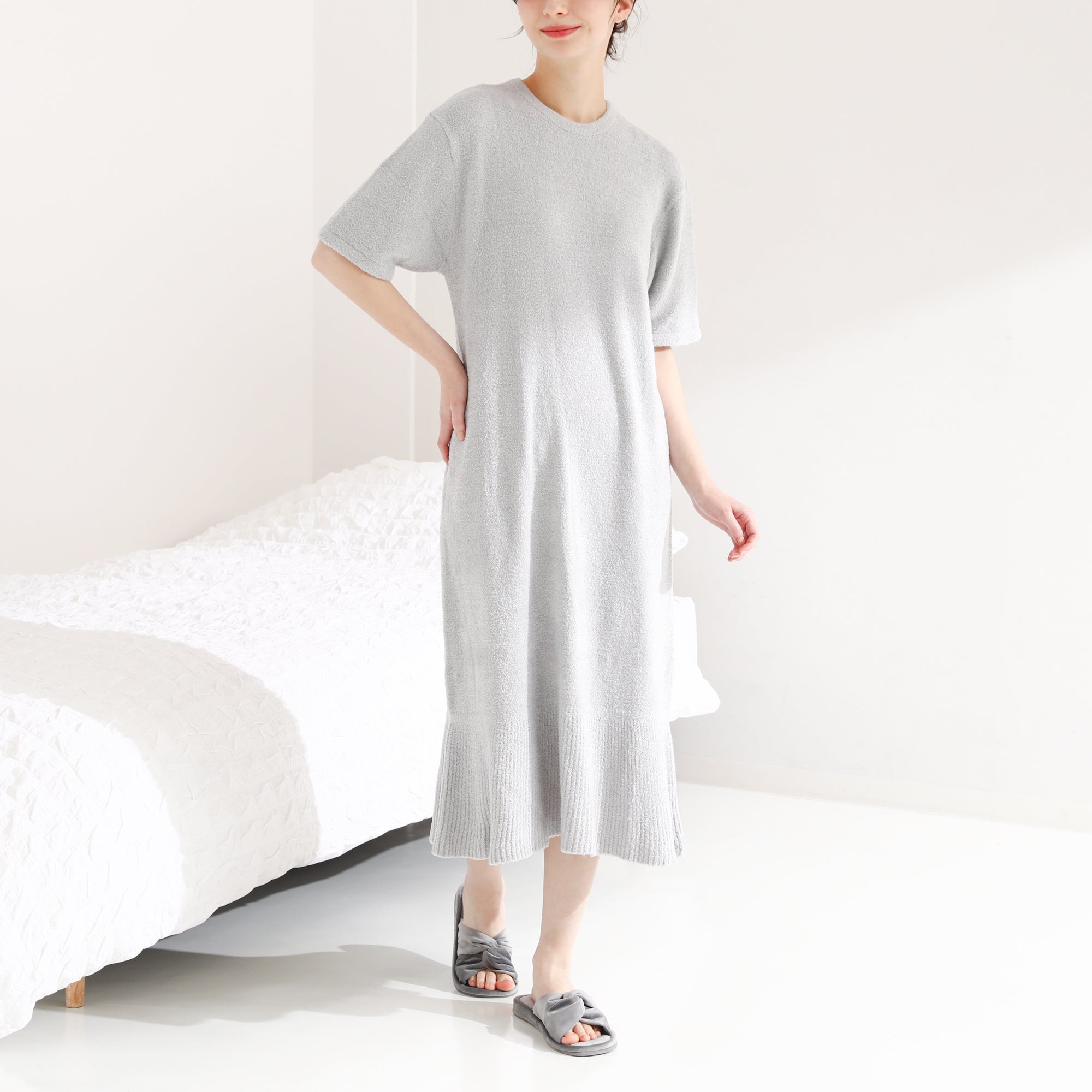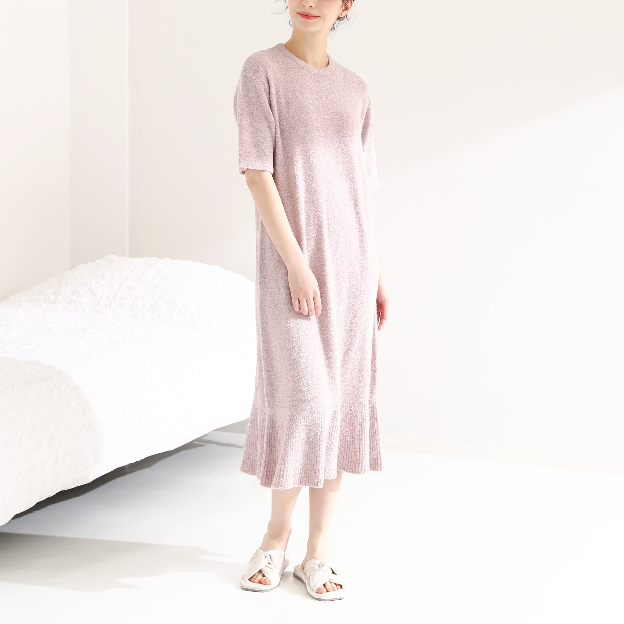 マーメイドラインのフリルが上品なワンピースタイプのルームウェアです。サラッと着れる接触冷感のニットで春夏も涼しくお過ごしいただけます。リモートワーク中のルームウェアとしてもおすすめのルームウェアです。