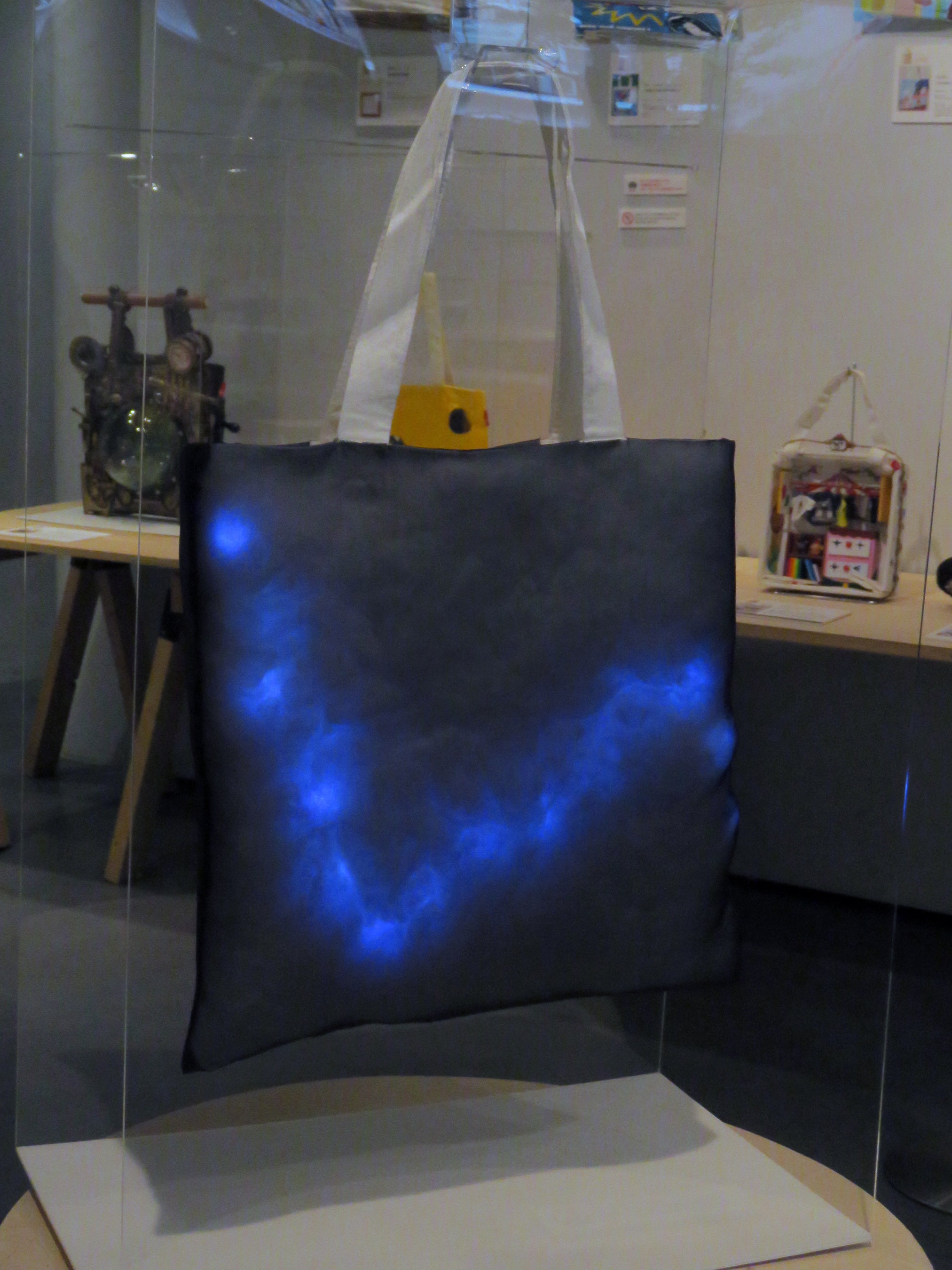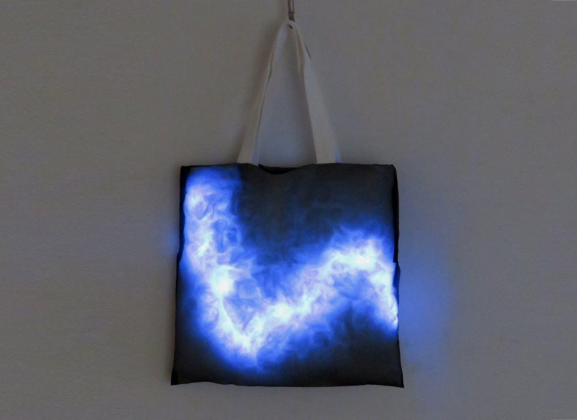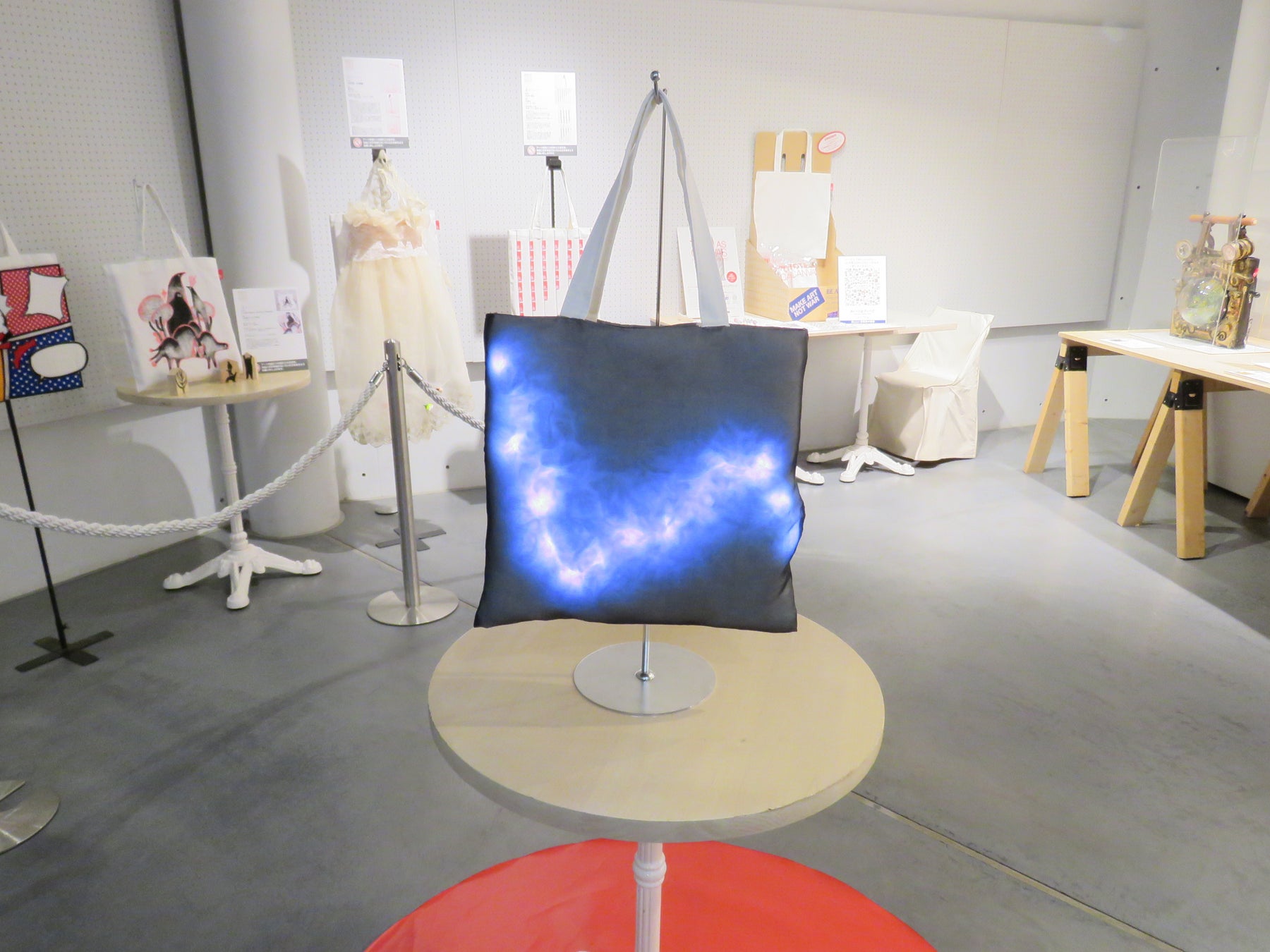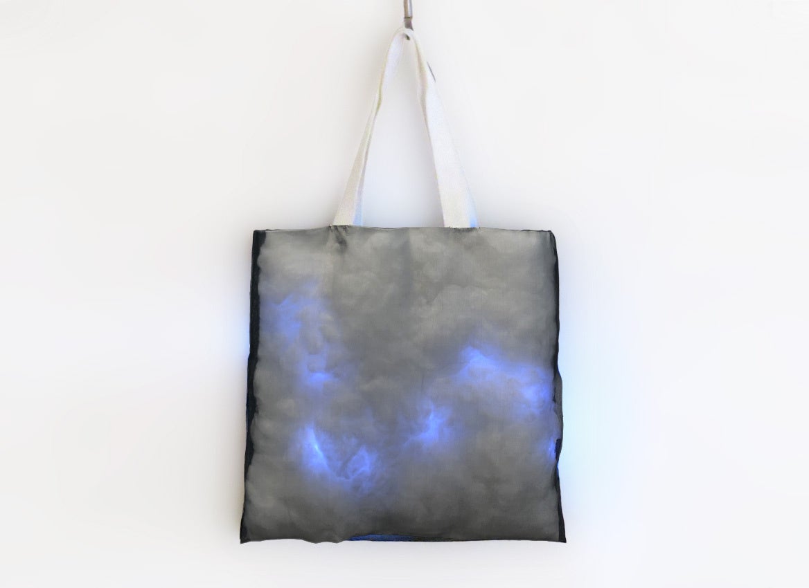 ROOTOTEのアートを表現するための無地のトートバッグ「トート・アズ・キャンバス」と、フェアリーライトやオーガンジーの布地などを使用して、不気味な雰囲気の雷雲が表現されています。