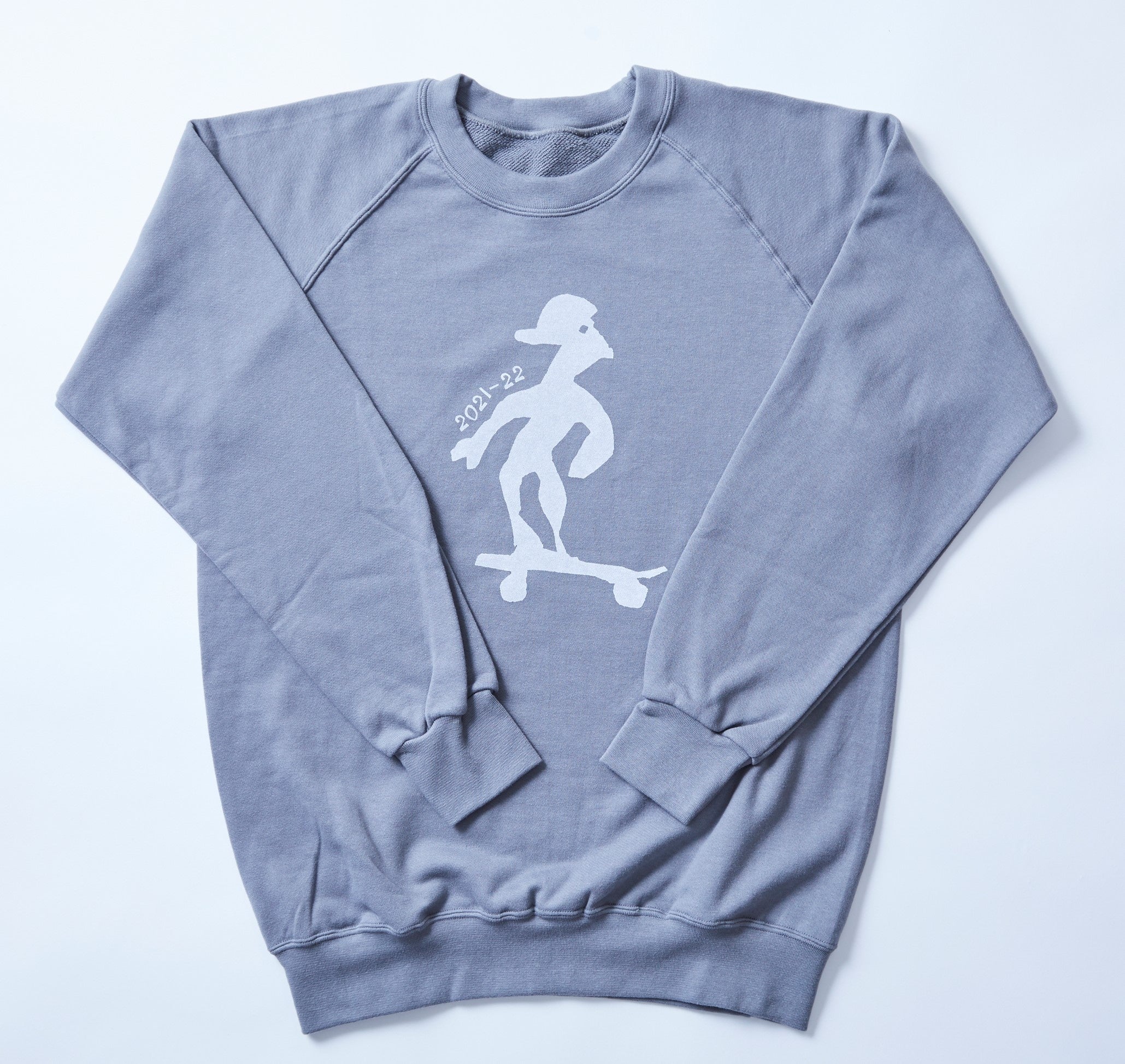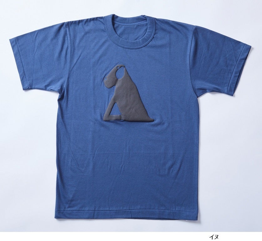 久米繊維工業は日本製Tシャツの先駆けとなる「色丸首」を開発したTシャツメーカー。展覧会のために描き下ろされた絵柄「イヌ」と「スケボー」をワンポイントに。染み込みプリントでヴィンテージ風の仕上がり。
