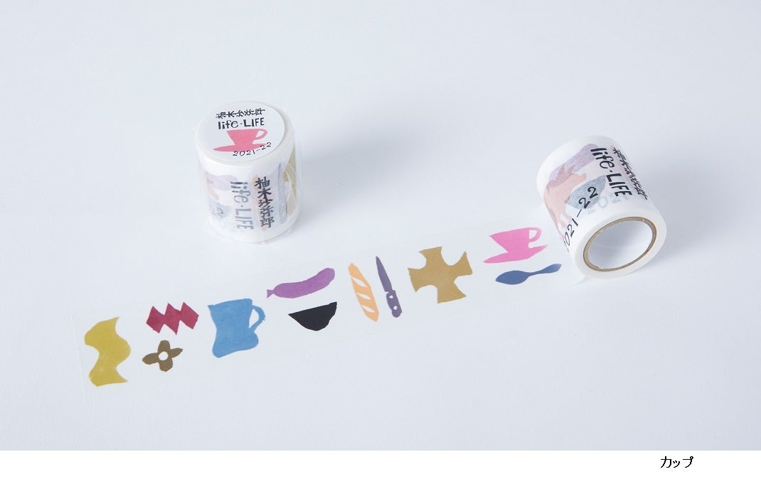 幅50mmの大きなマスキングテープ。絵柄は「カップ」と「クロス」。(写真の絵柄は「カップ」)