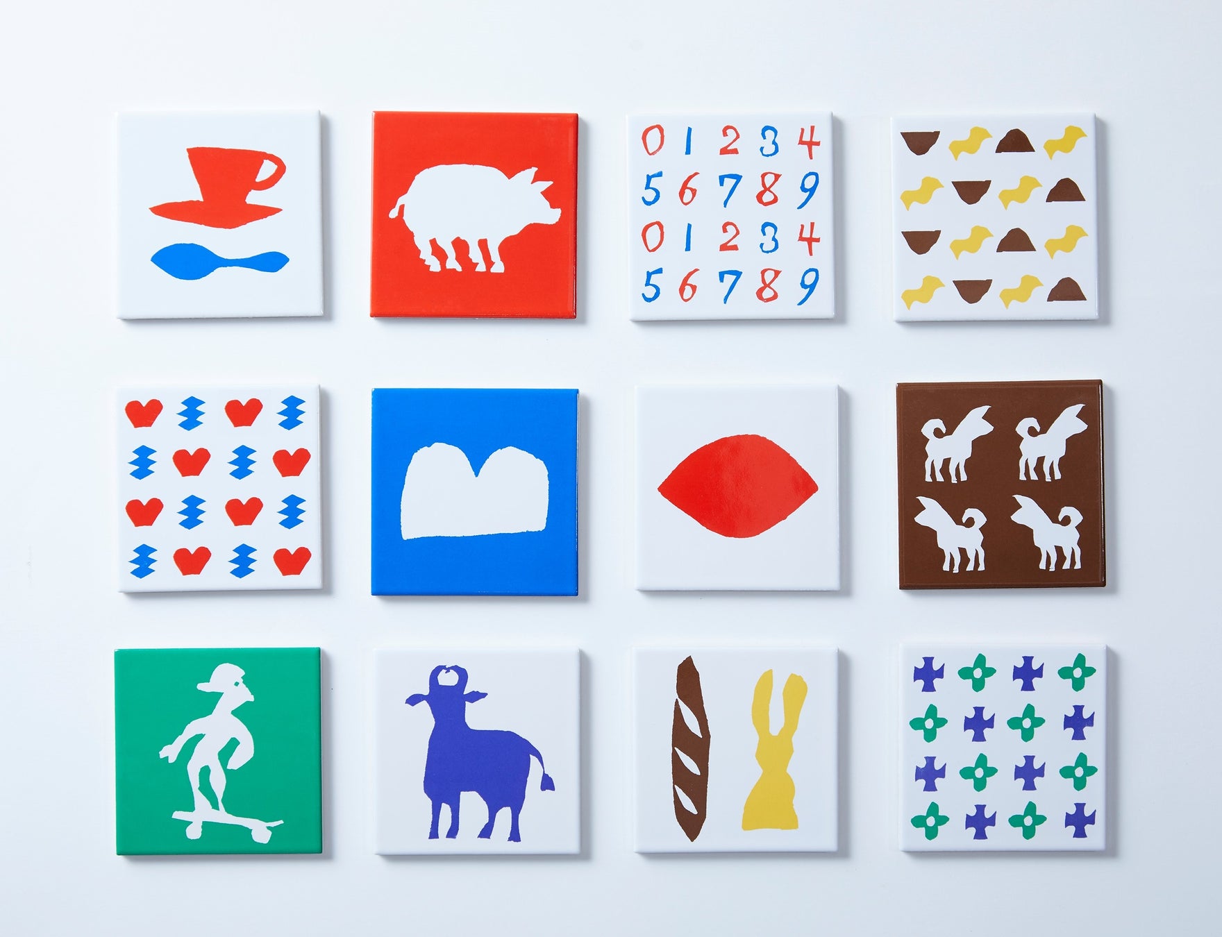 岐阜県多治見のタイルブランド「TAJIMI CUSTOM TILES」とのコラボレーション。展覧会のために柚木さんが書き下ろされた絵柄をカラフルなタイルに仕上げました。