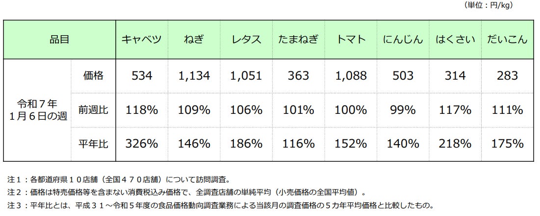 去年夏の猛暑に加え、先月12月に気温が低く雨が少なかったことなどの影響を受け、野菜の価格が高騰しています。農林水産省の食品価格動向調査(※2)によると、令和7年1月6日週の調査結果では、キャベツの価格が平年比326%、はくさいの価格が218%と、調査対象の8品目全てで価格が平年を上回る状況となっています。