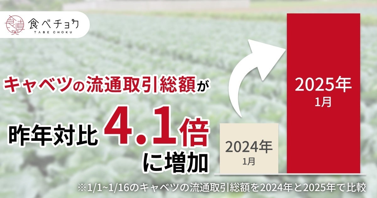 そのような中、食べチョクでは1月に入り、キャベツの注文が殺到しており、流通取引総額が昨年同期比4.1倍に増加しました。その他の野菜でもレタスが2.5倍、はくさいが2倍、ねぎが1.7倍と昨年同期比で比較して急増しています。