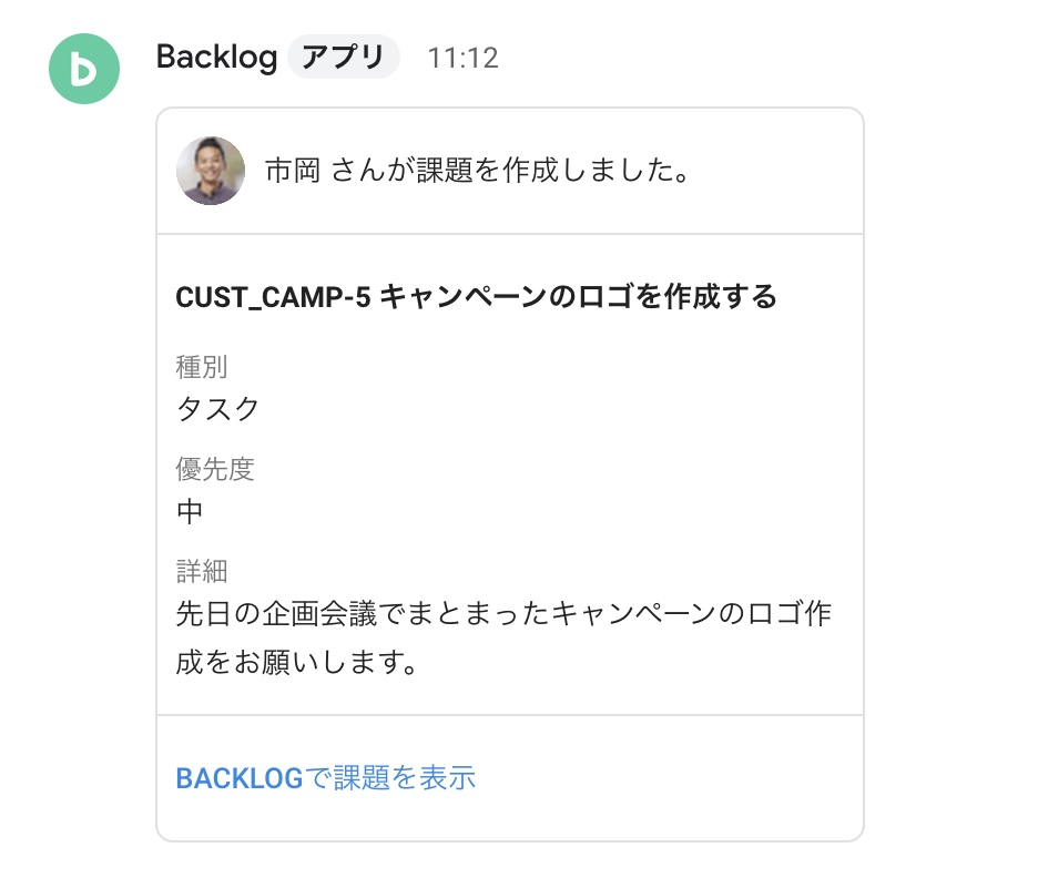 また、Google Chatの画面上でBacklogの課題を追加することも可能です。