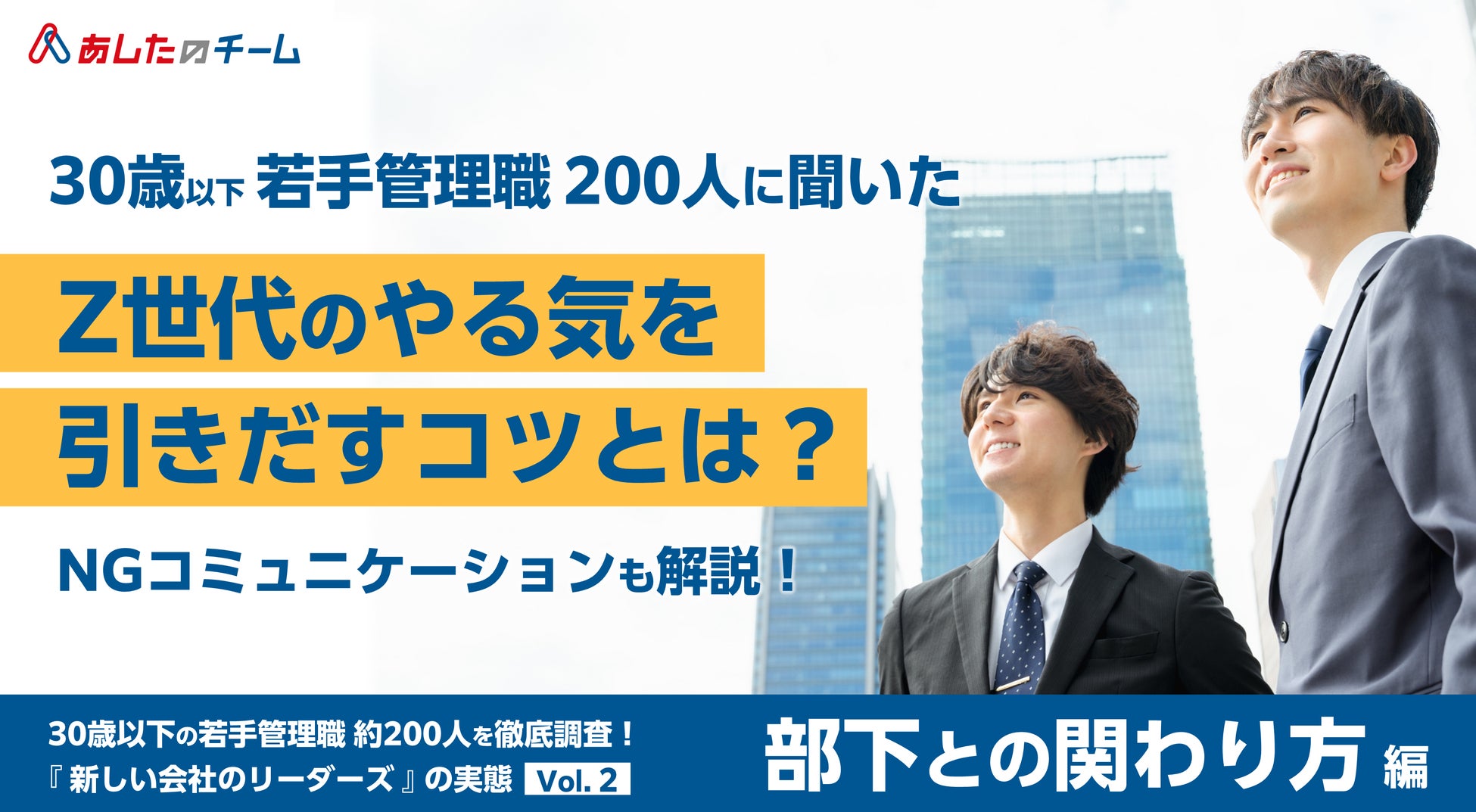 第2弾となる今回は「部下との関わり方」に関する調査結果を公開します。いわゆる“Z世代”に近い年代の若手管理職「新しい会社のリーダーズ」だからわかる、Z世代社員との付き合い方が調査により明らかになりました。