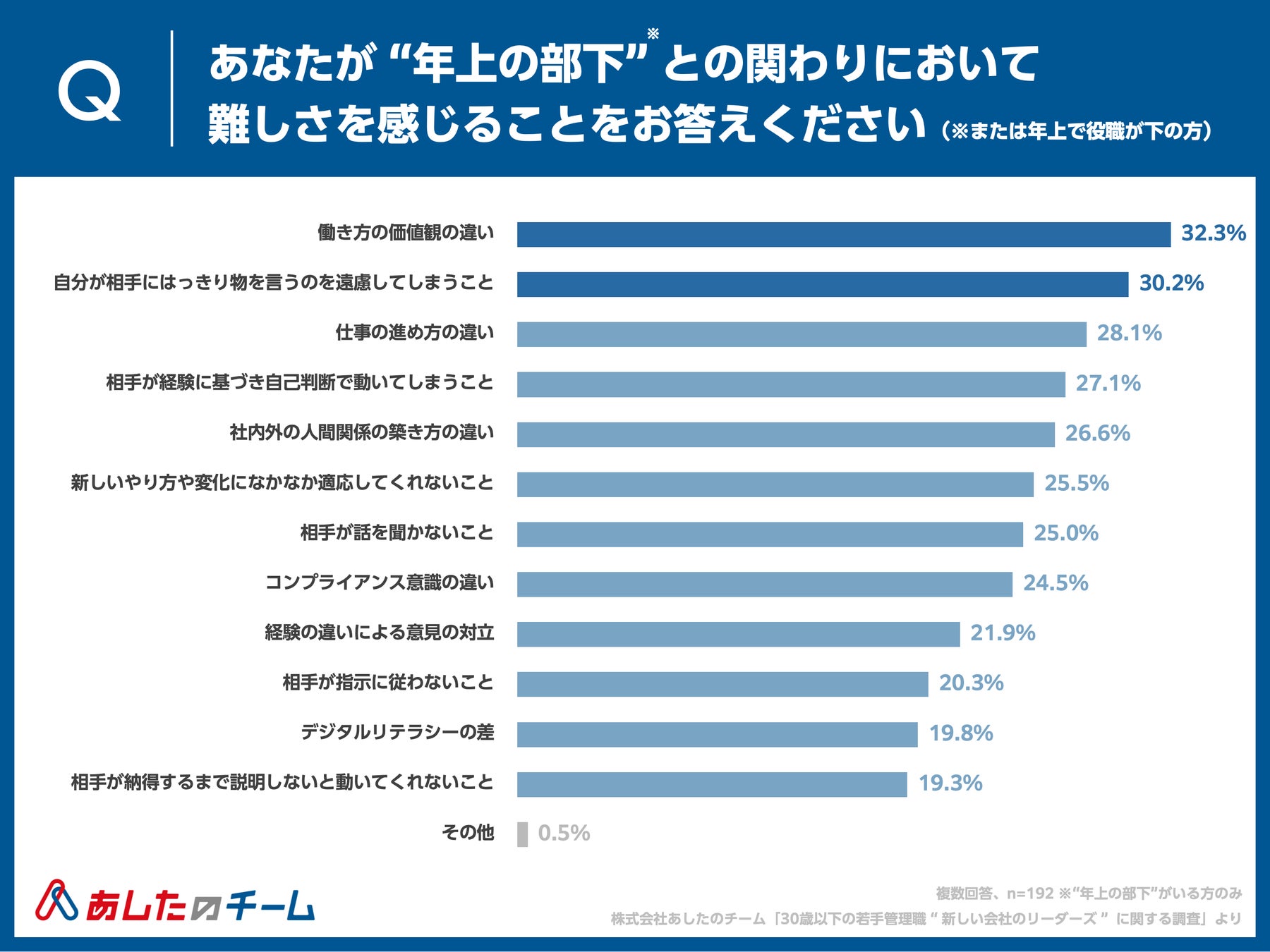 “年上の部下” のマネジメントで苦心すること 1位「働き方の価値観の違い」32.3%。