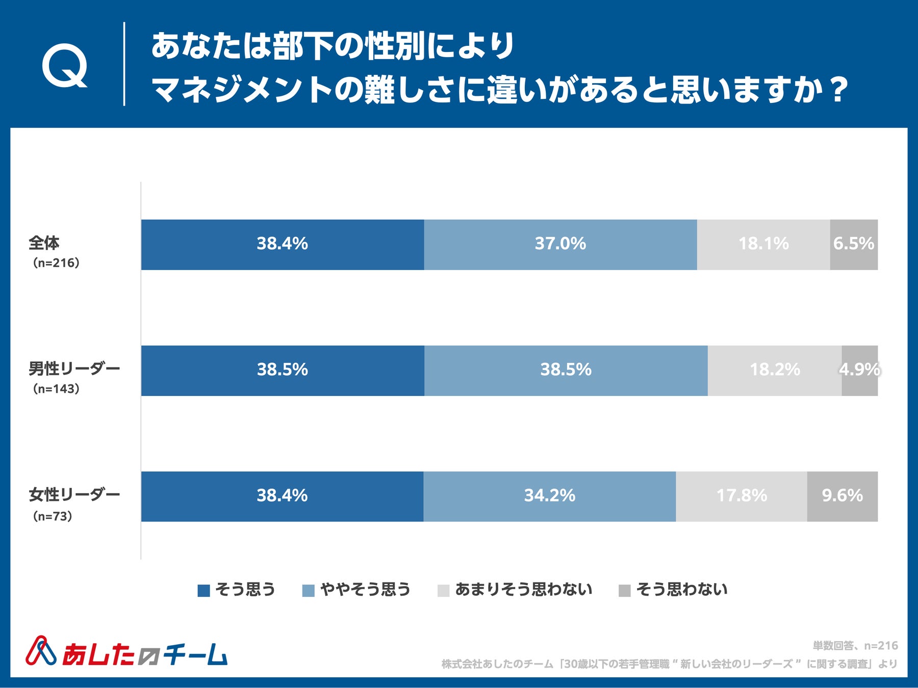 部下の性別によってマネジメントの難しさに違いがあると思うかについても聞いてみました。その結果、「そう思う」38.4%、「ややそう思う」37.0%と、7割以上が男性の部下と女性の部下、それぞれのマネジメントの難しさを感じていることがわかりました。男性リーダーと女性リーダーで回答割合に大きな差はありませんでした。