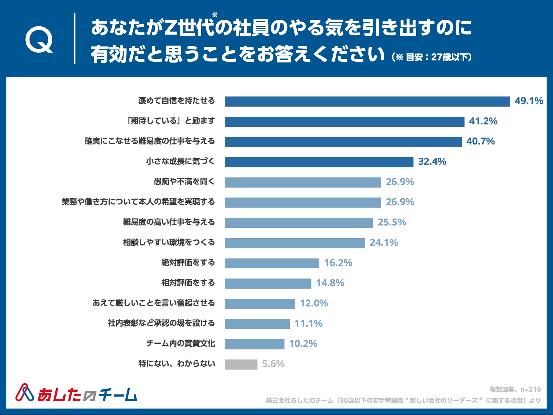 Z世代社員のやる気を引き出すのに有効なこと、トップは「褒めて自信を持たせる」49.1%。