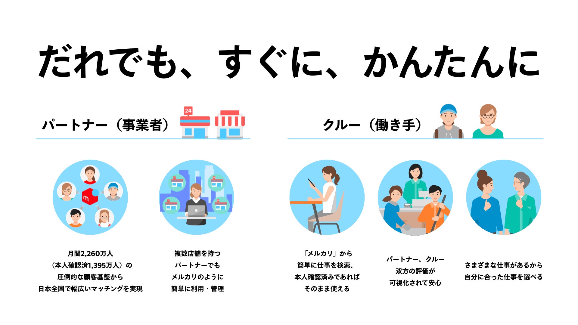 加えて、スポットワークの活用に不安が大きいパートナーに対しても、月間2,260万人(うち本人確認済1,395万人※1)の顧客基盤を活用し、幅広い属性・経験を持つクルーとのマッチングを実現します。