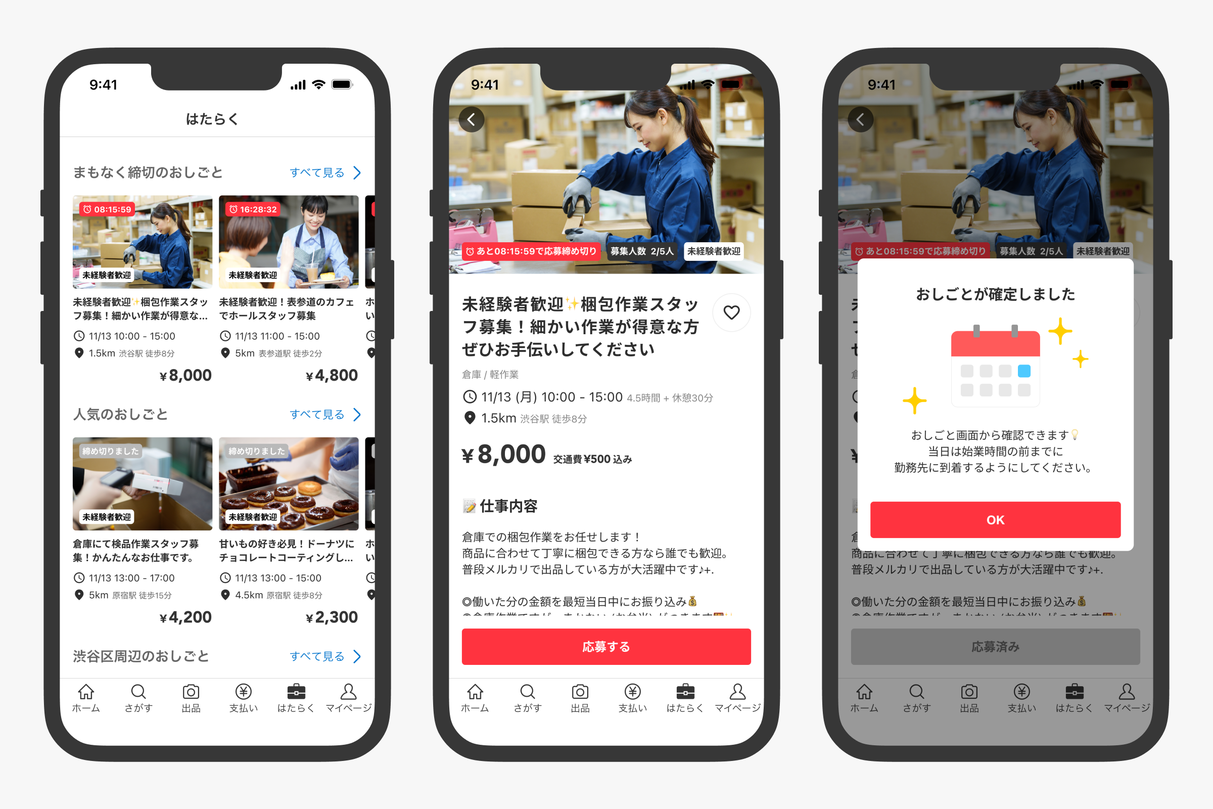 メルカリグループは、スポットワーク事業への参入を通じて「だれでも、すぐに、かんたんに」仕事を見つけられる体験を提供することで、「働く」をより気軽なものにし、誰もが自分のやりたいことを実現できる世界を目指してまいります。