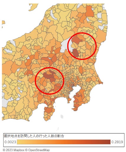 また、日光を訪問したバイクライダーが他にどの地域を訪問しているかを確認したところ、秩父市や奥多摩町、宇都宮市、那須塩原市なども訪問していることがわかります。景観の良いルートを求めて他の地域へ訪問したり、隣接する地域に立ち寄ったりしていることがうかがえます。