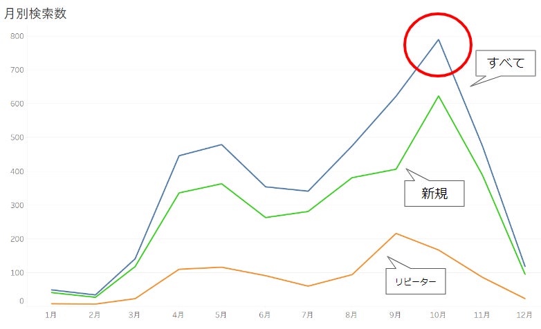 分析機能としては、地域ごと、年/月ごと、⽬的地/出発地/経由地ごとの検索数と実訪問数を確認することができます。これらの検索履歴や移動実績データを活用して、バイクライダーがいつどこに移動しようと検索し、また実際に移動したかどうかといった、移動需要を分析することが可能です。
