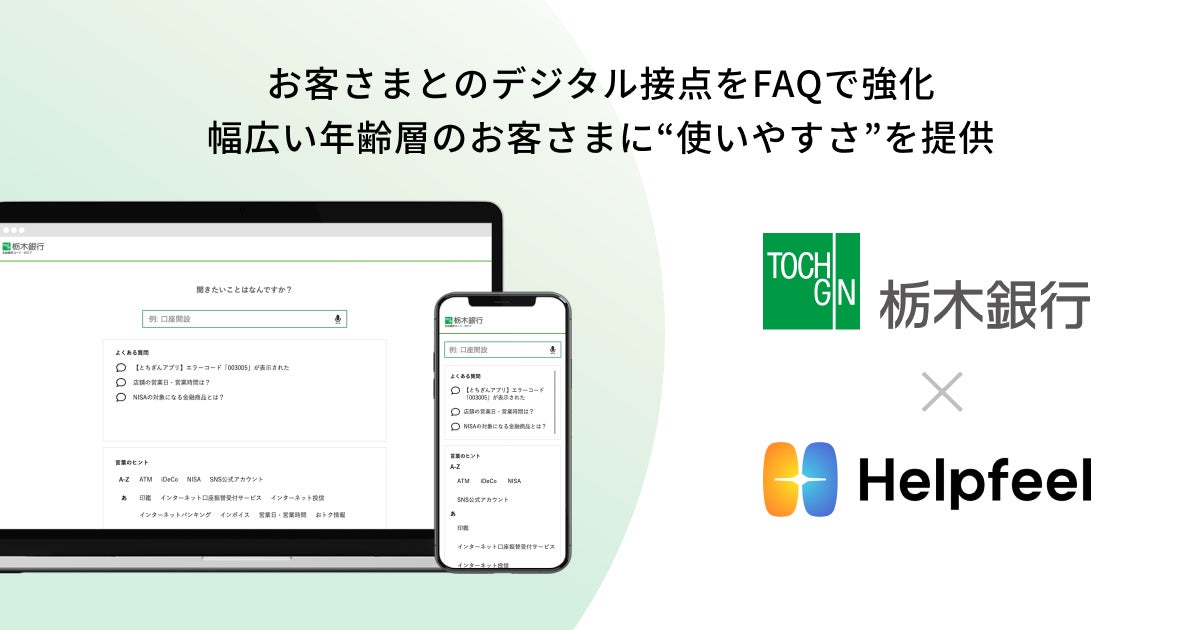 株式会社Helpfeel(京都府京都市、代表取締役/CEO:洛西 一周、以下 当社)は、株式会社栃木銀行(栃木県宇都宮市、取締役頭取:黒本 淳之介 、以下 栃木銀行)に検索型AI-FAQ「Helpfeel(ヘルプフィール:https://www.helpfeel.com )」を導入いただいたことをお知らせいたします。