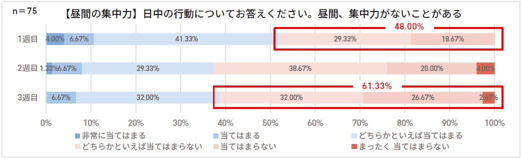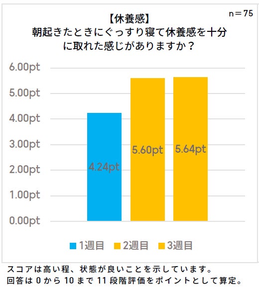 また、この取り組みによる変化を検証するため、就寝前にブルーライトカットメガネをかけない期間とかける期間で、睡眠をはじめ昼間の眠気や集中力についてアンケート調査を実施。アンケート結果から、良い睡眠の指標とされる「休養感」の平均は、ブルーライトカットメガネをかけない期間は4.24ptでしたが、かける期間では5.64ptに上昇。また、増えると睡眠の質・量が悪化すると言われている「夜起きる回数」が2回以上と答えた人は、ブルーライトカットメガネをかけない期間は45.33%でしたが、かける期間では22.67%に減りました。他にも「昼間に眠い」と感じるかという質問に「当てはまらない」と答えた人は、ブルーライトカットメガネをかけない期間は21.33%でしたが、かける期間では52.00%と約2倍に増えました。さらに、「昼間に集中力がない」と感じるかという質問に「当てはまらない」と答えた人は、ブルーライトカットメガネをかけない期間は48.00%でしたが、かける期間では61.33%に増加しました。