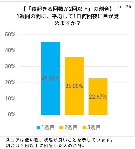 夜起きる回数も重要で、多いと睡眠の質や量が低下し、勤労世代なら2回以上起きる場合は改善が必要とされています。今回介入後は夜起きる回数が2回以上の割合がほぼ半減する結果となりました。