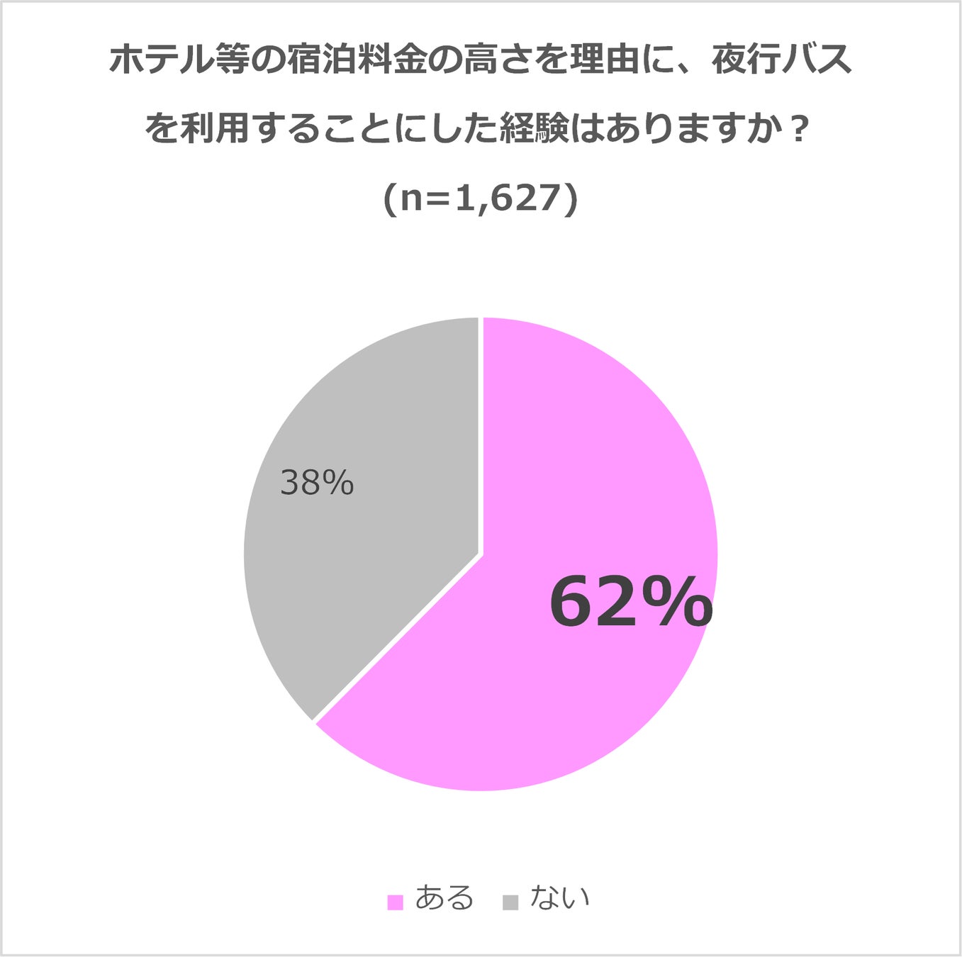 アンケート調査の結果は、「ここ1年でホテル等の宿泊料金が高くなった」と感じているお客様は85%に達しました。そのうち、62.9%のお客様が「ホテル等宿泊料金の高さを理由に、夜行バスを選択した」と回答しており、宿泊料金の高騰が夜行バスの利用に繋がっていることが明らかになりました。