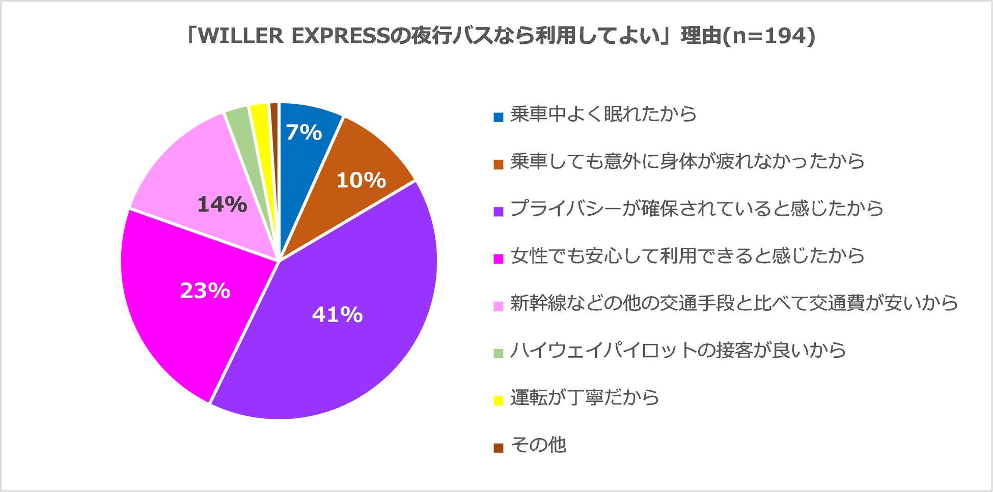 さらに、宿泊料金が高くなる前の夜行バス利用が“数年に1回”以下だったお客様のうち、「今後ホテル等の宿泊料金がコロナ前ほどに下がったとして、「WILLER EXPRESS」の夜行バスなら利用してもよい」と回答したお客様は54%でした。その理由を尋ねたところ、「プライバシーが確保されていると感じたから」が41%、「女性でも安心して利用できると感じたから」が23%と多数を占めました。