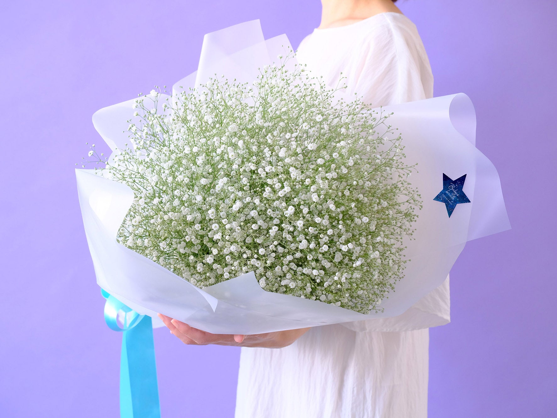 たっぷりの昭和かすみ草と小花、グリーンを合わせたギフトにピッタリなブーケ。季節のご挨拶やお誕生日のギフトにもぴったりです。爽やかな組み合わせが涼風を運びます。