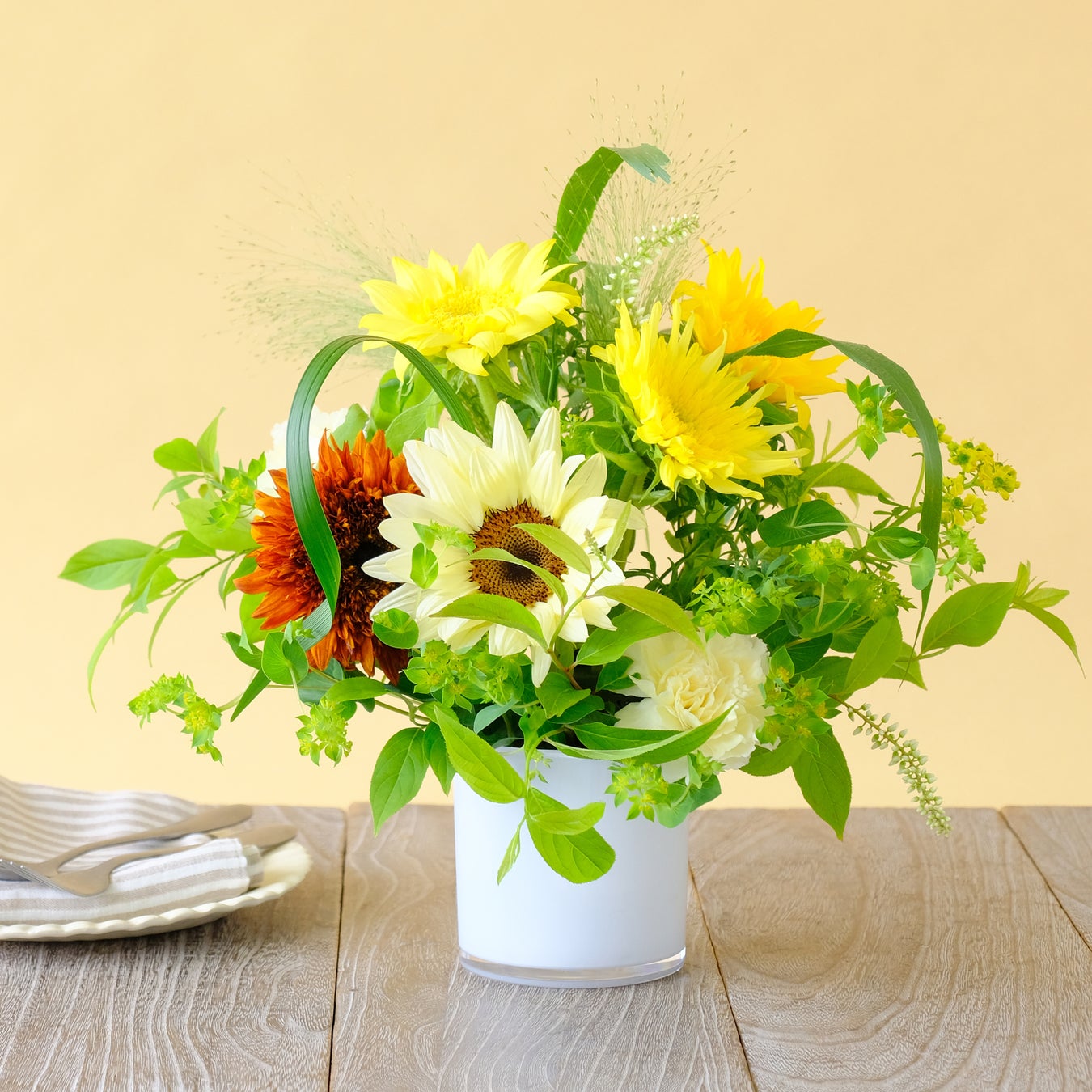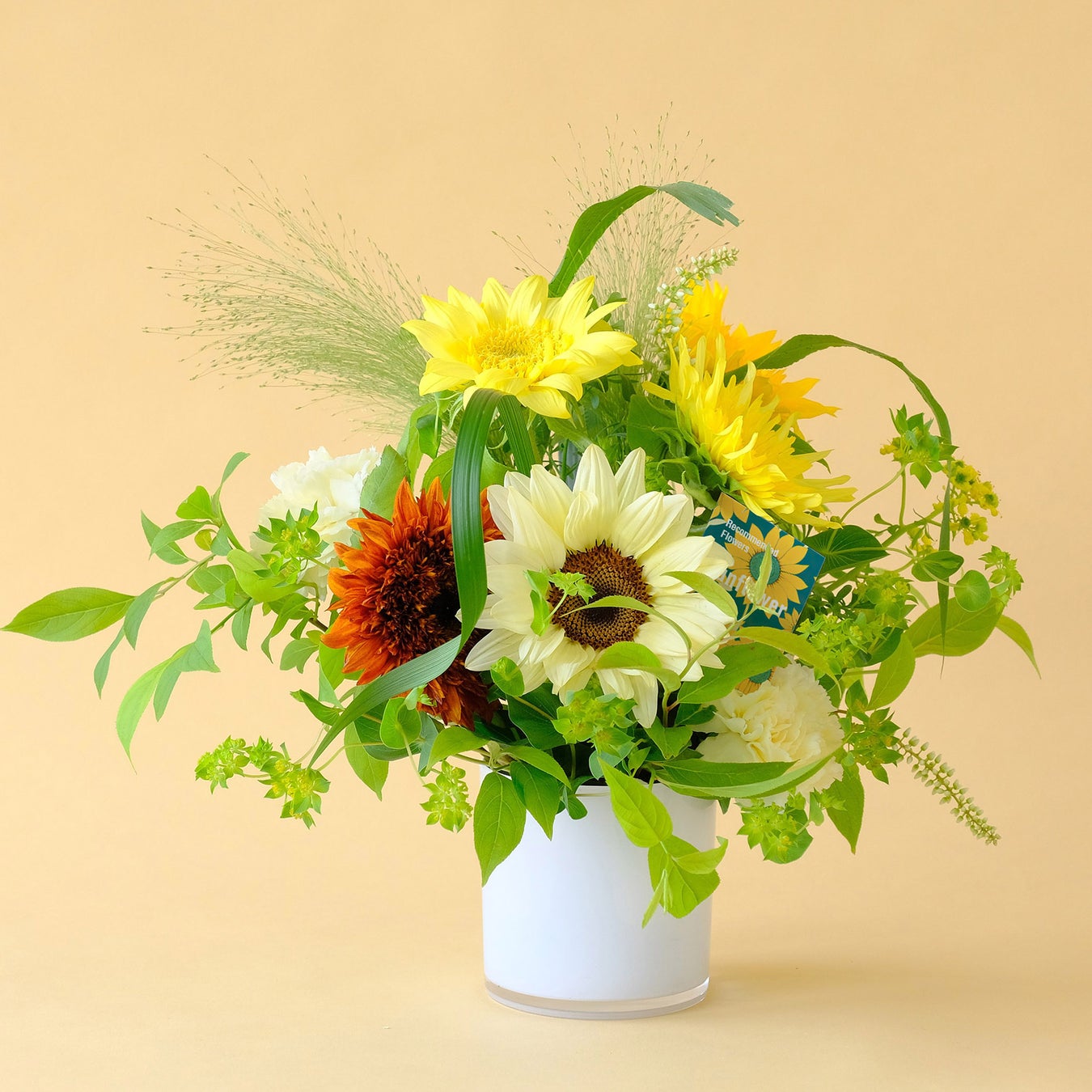ショップおすすめのヒマワリとみずみずしいグリーンと合わせて、夏らしいアレンジメントに仕上げました。器付きでそのまま飾って楽しめます。