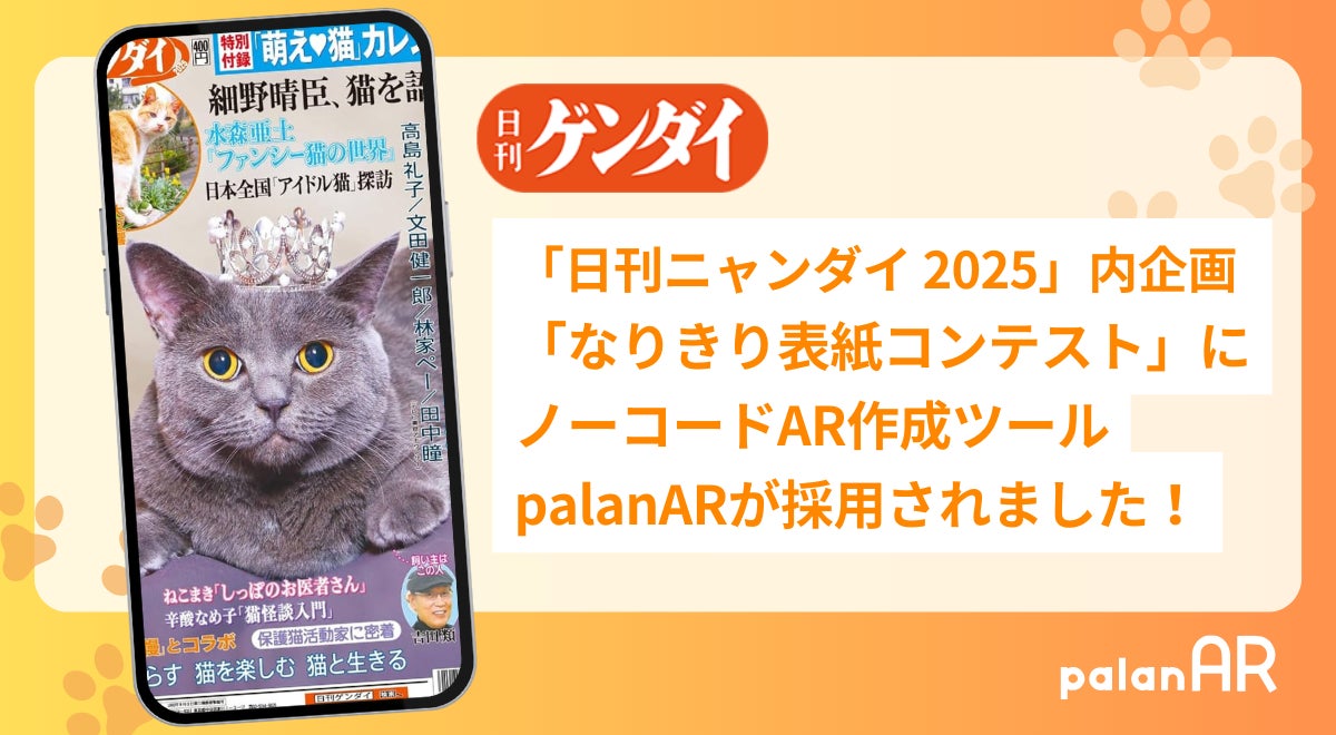 AR(拡張現実)開発を行う株式会社palan (本社:東京都渋谷区、代表取締役:齋藤 瑛史)提供するWebAR作成サービス「palanAR(パラナル)」が、日刊ゲンダイが発行する「日刊ニャンダイ 2025」内の企画「なりきり表紙コンテスト」に採用されました。