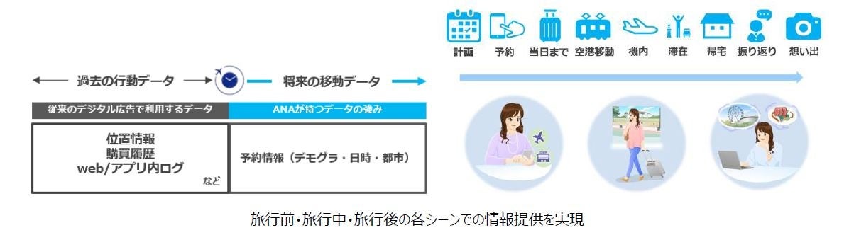 デジタル広告が普及し、お客様が多くの情報から取捨選択を求められる昨今において、本サービスはお客様にとって違和感のないタイミングで有益な情報を提供します。お客様には、旅行前・旅行中・旅行後の各シーンで、ANAのオウンドメディア(各種アプリ、ANAウェブサイト等)や、その他SNS等の幅広いメディアを通じて、行動のタイミングに合致した有益な情報を取得していただくことができます。