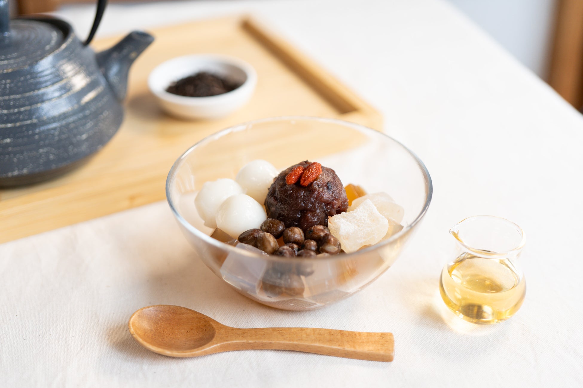 小豆の風味豊かなつぶあんはちょうどよい甘さで、さっぱりとした白蜜で甘さを調整しながらお召しあがりいただけます。コリコリの寒天、粒感を残した大納言小豆餡、もちもちの白玉など異なる食感がアクセントとなり、口福な時間をお過ごしいただけます。