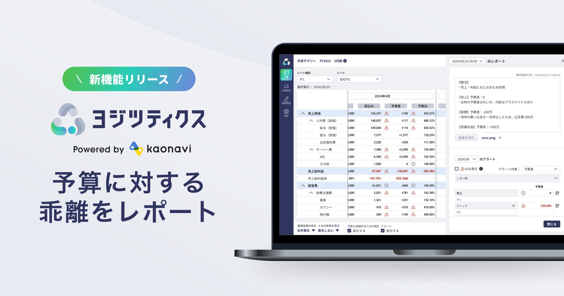 株式会社カオナビ(本社:東京都渋谷区、代表取締役社長CEO:佐藤 寛之)が提供する予実管理システム「ヨジツティクス」は、予算に対して見込みや実績数値が乖離した際にアラートを出し、レポートする機能を2025年10月30日(木)に提供開始します。