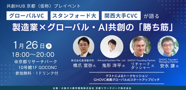 京都リサーチパーク株式会社(本社:京都市下京区、代表取締役社長: 浅野 貢男)、大阪ガス都市開発株式会社(本社:大阪市中央区、代表取締役社長:友田 泰弘、以下「大阪ガス都市開発」)は、「グローバルVC・スタンフォード大・関西大手CVCが語る、製造業×グローバル・AI共創の「勝ち筋」」と題して、「関西の大手モノづくり企業×グローバルAIスタートアップ」の共創の可能性を探るイベントを2026年1月26日に開催します。