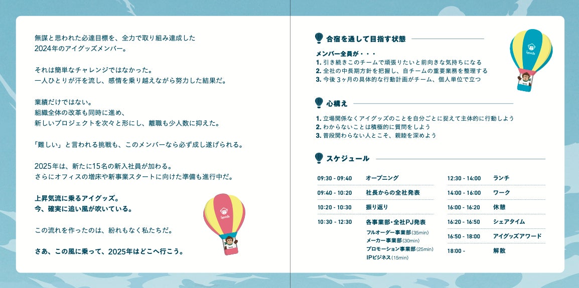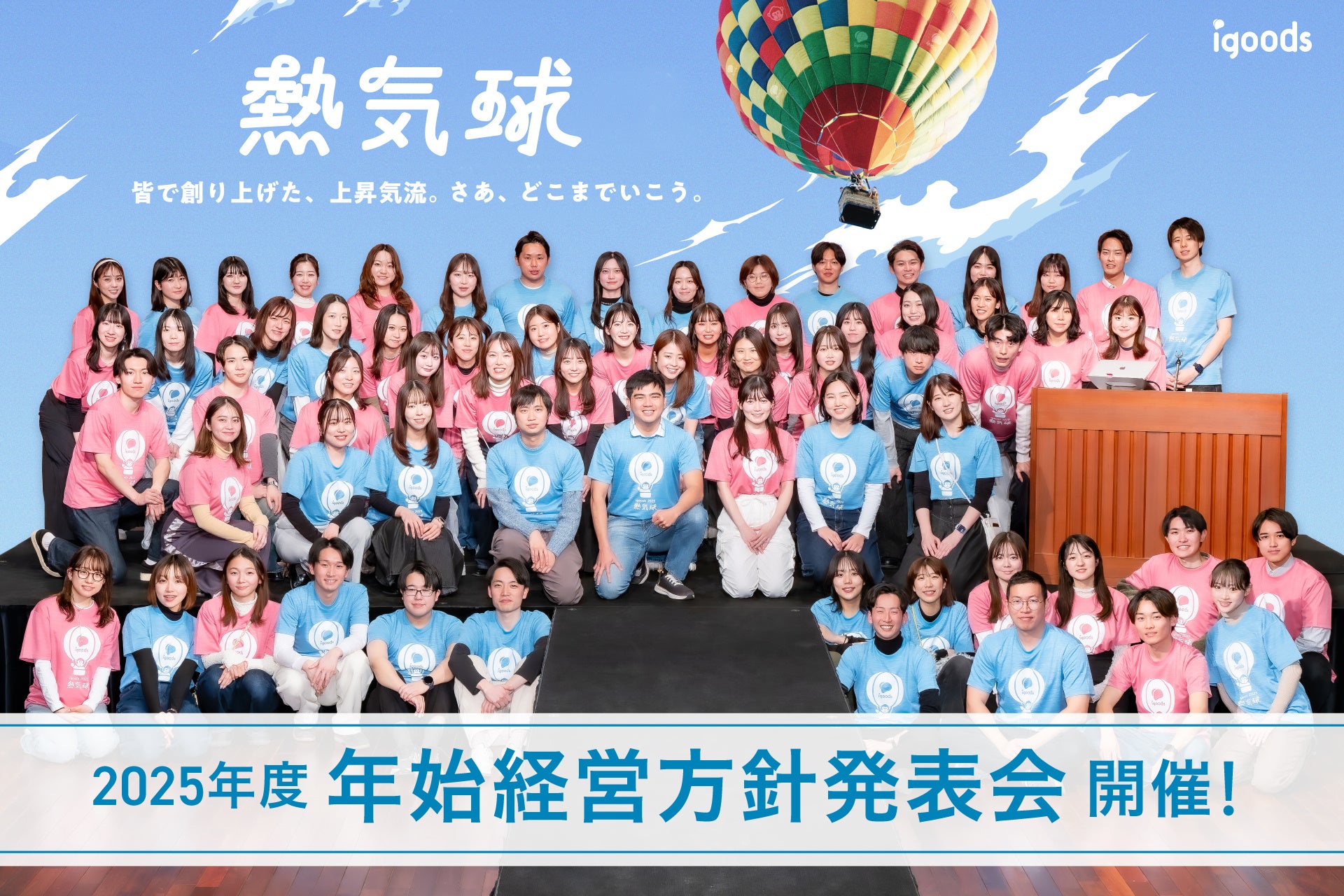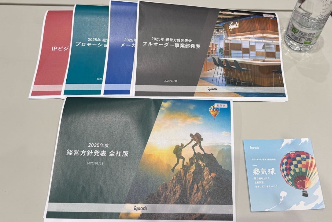 オリジナルグッズを企画・制作するアイグッズ株式会社(本社:東京都渋谷区)は、2025年1月11日(土)に「2025年度 年始経営方針発表会」を開催しました。年に3回実施する経営方針発表会の中でも、年始はその年の全社方針が決定する重要な時間。今回は「熱気球」というテーマのもと、事業・組織の成長を遂げて上昇気流に乗るアイグッズの、今後の目標と行動計画を見つめる1日となりました。
