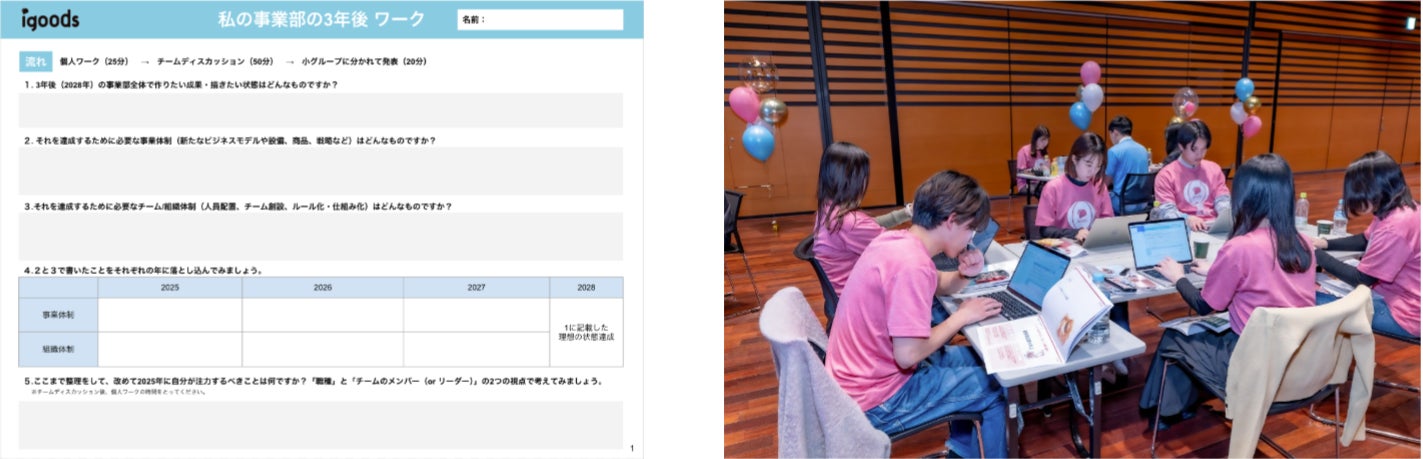 そこで、近すぎず遠すぎない3年後に向けて、「これからのアイグッズが成長するために、自チームではどのような成長を描いていくべきか」「そのために今年、自分が注力すべき点はどこか」を考えるワークを実施。このワークを経て、実際に社員からは「業界特有の廃棄物を回収〜資材化できるようなビジネスモデルを強化したい」「一人ひとりの専門性を磨き、さらなる分業体制を敷きたい」といった具体的な意見が上がり、追っていくべき理想像を整理する機会となりました。