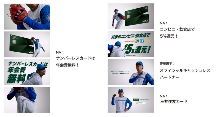 三井住友カードが発行する三井住友カード(NL)、三井住友カード ゴールド(NL)、三井住友カード プラチナプリファードは、対象のコンビニ・飲食店にて、Visa のタッチ決済やMastercard®コンタクトレスでお支払いいただくと、ポイントが最大 5%還元される、日常使いにとても"便利"で"お得"なクレジットカードです。今般、ファイターズファンの皆様に向けて、伊藤大海選手の躍動感溢れるピッチングシーンと共に、三井住友カード(NL)の「便利」「お得」を訴求していきます。