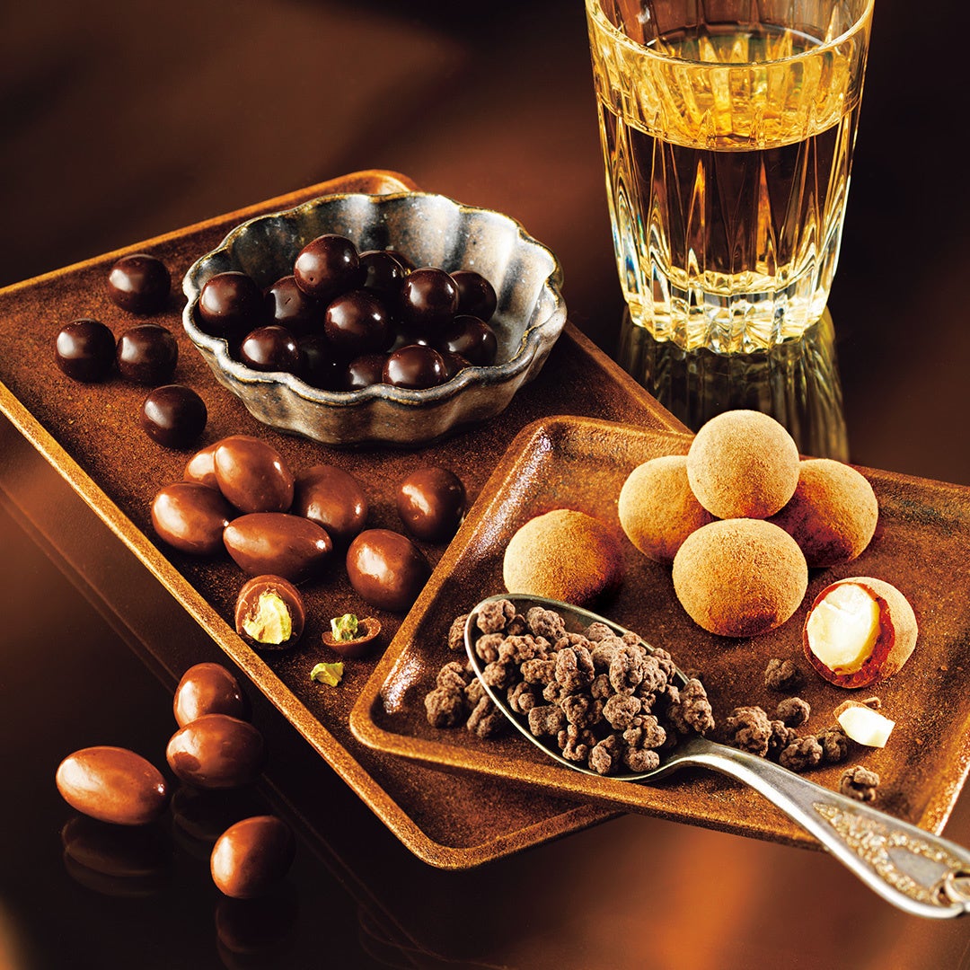 "ウイスキーの最高のパートナーになるチョコレートをつくりたい"という想いのもと、カカオ感や素材の食感、粒の大きさにもこだわって仕上げました。力強いカカオ感の[カカオ62%]、ベリーとピスタチオが濃厚な味わいを生み出す[ラズベリーピスタチオ]、カカオニブの独特の食感とほろ苦さが広がる[カカオニブ]、ナッツのコクと黒糖の旨みある味わいを組み合わせた[黒糖マカダミア]の4種類をセットに。
