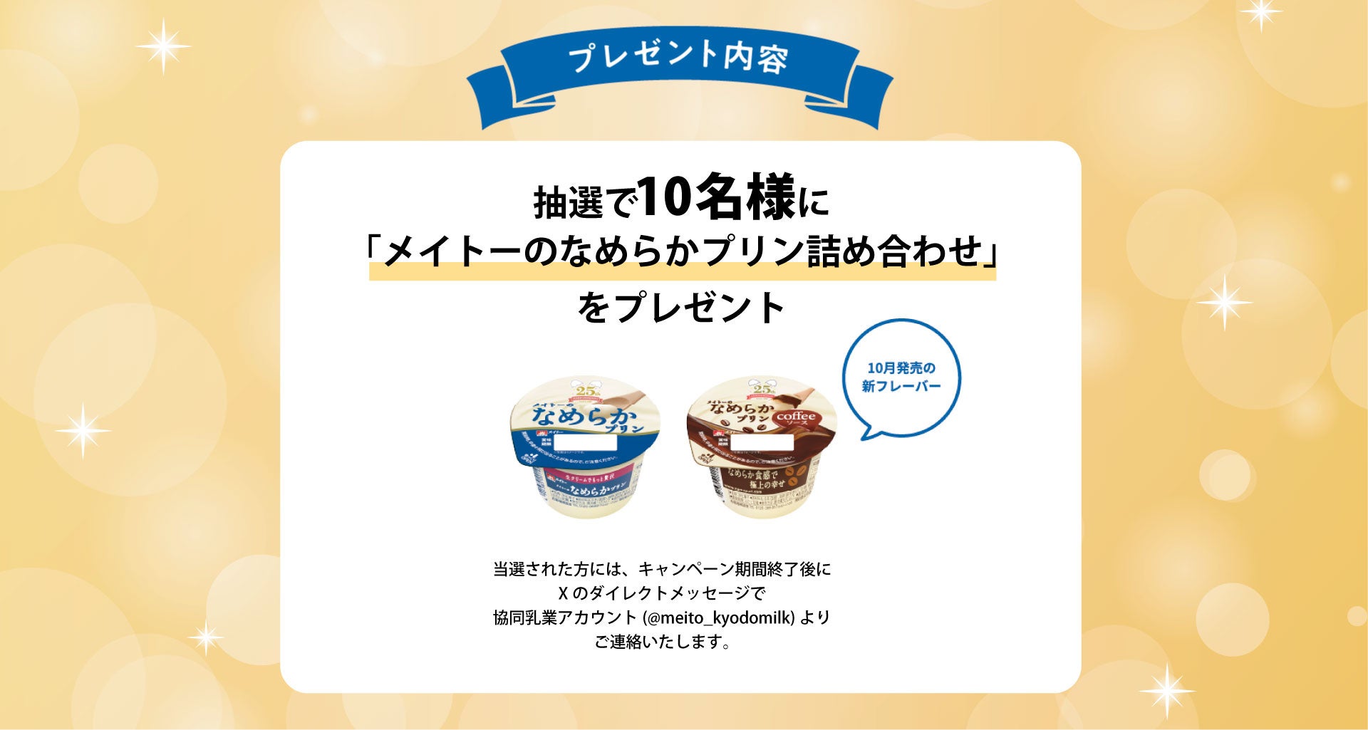 また、投票に参加いただいた方の中から抽選で10名様に「メイトーのなめらかプリン詰め合わせ」をプレゼントいたします。詰め合わせは、10月発売の新商品も含んだセットとなっています。あなたの投票が発売する商品を決める「メイトーのなめらかプリン 新フレーバー投票キャンペーン」。ぜひ皆様のご参加をお待ちしております。
