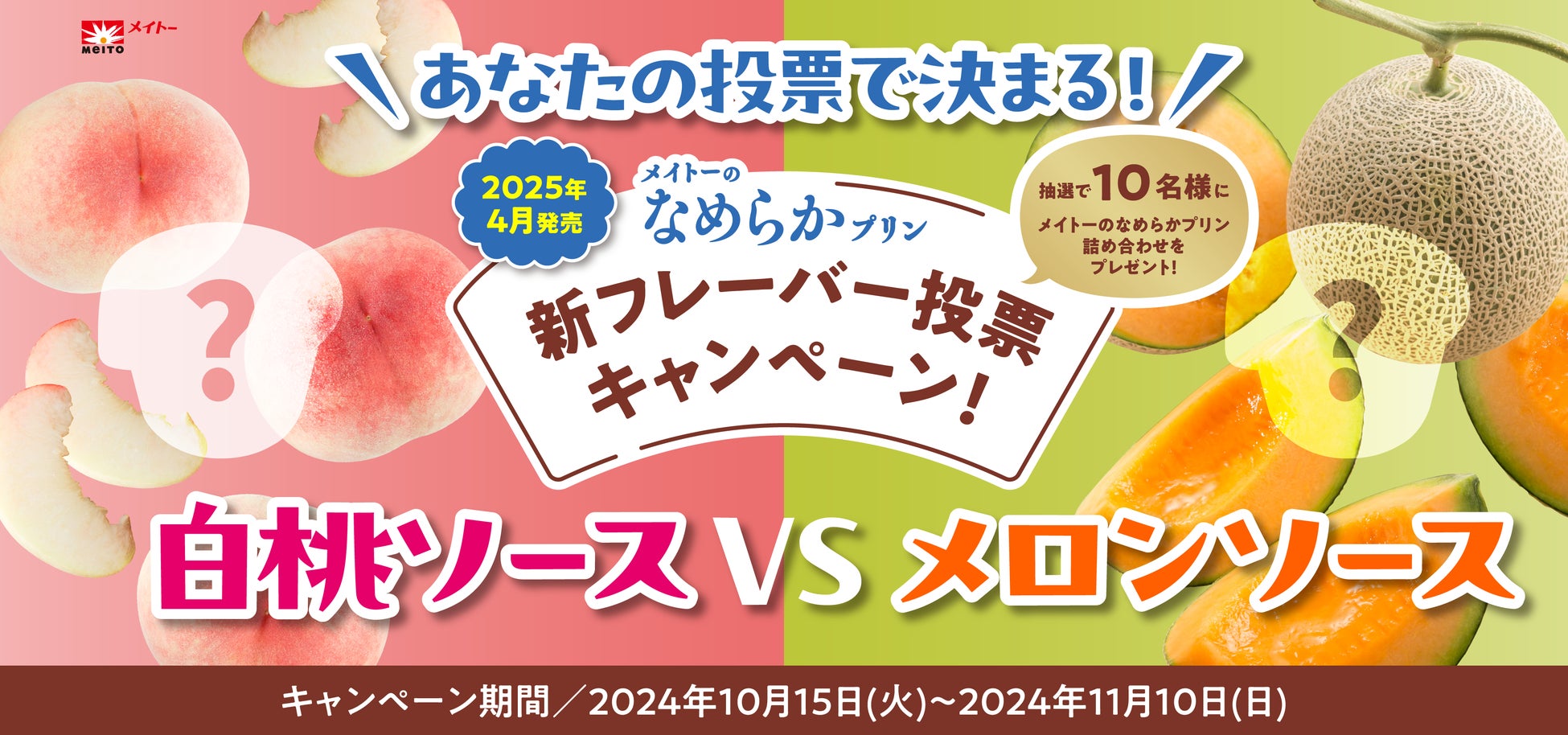 「メイトーのなめらかプリン 新フレーバー投票キャンペーン」は、協同乳業の大人気商品「メイトーのなめらかプリン」の新フレーバーを消費者投票で決定するXキャンペーンです。選ばれたフレーバーは、2024年11月中下旬に発表し、2025年4月に発売いたします。新フレーバー候補2種類(白桃ソースor赤肉メロンソース)から食べたいフレーバーを選び、白桃ソースならキャンペーン投稿に“いいね“、赤肉メロンソースならキャンペーン投稿を”リポスト“して投票してください。