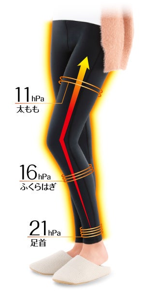 足首から上へいくほど圧力が低くなる設計(足首21hPa、ふくらはぎ16hPa、太もも11hPa)で、