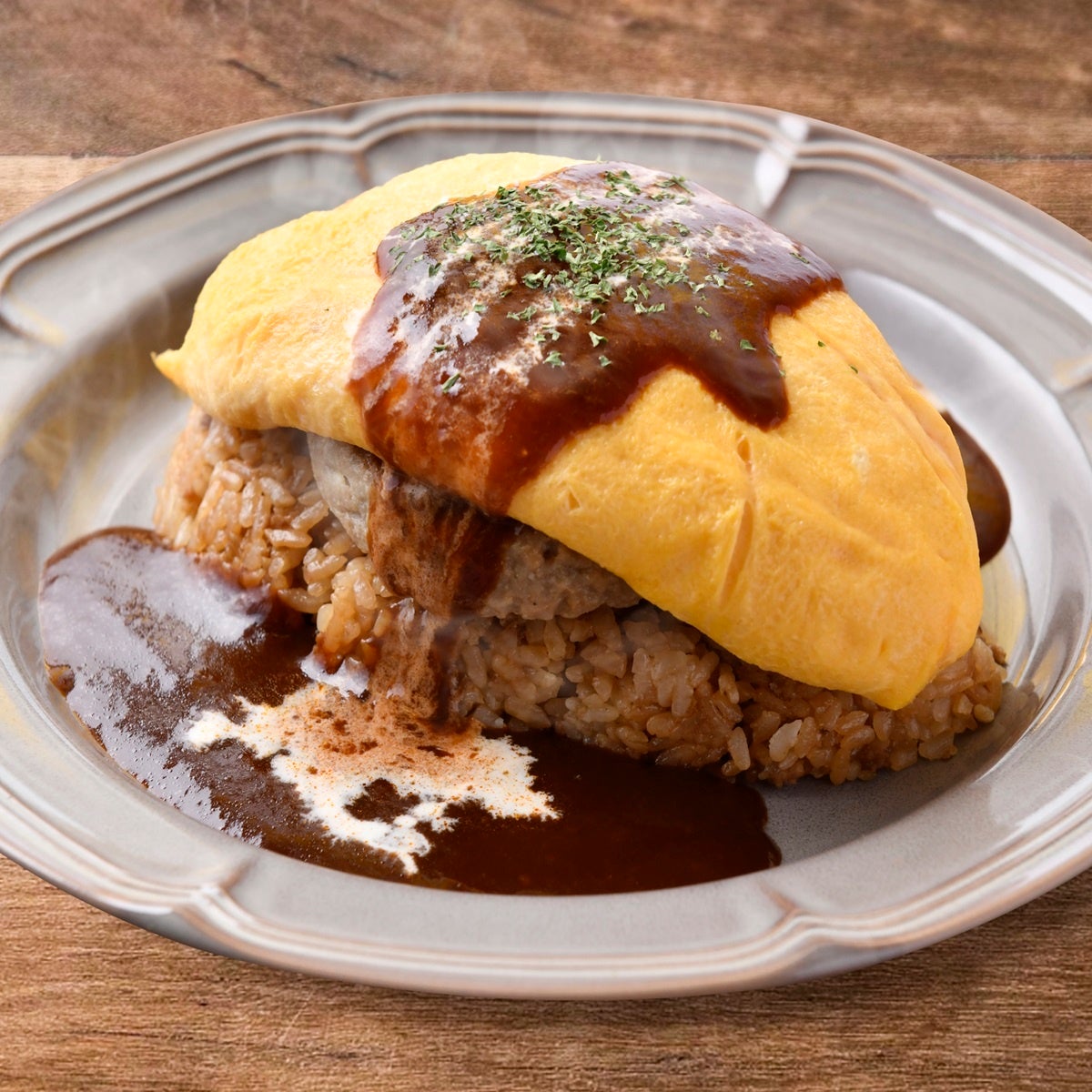 濃厚デミグラスソースをまとったふわとろオムライスに、ずっしり肉厚のチーズハンバーグを合わせた圧巻のビジュアルが大人気!お肉の旨味とチーズ、卵のコクと甘みが奏でるおいしさのハーモニーをお楽しみいただけます。