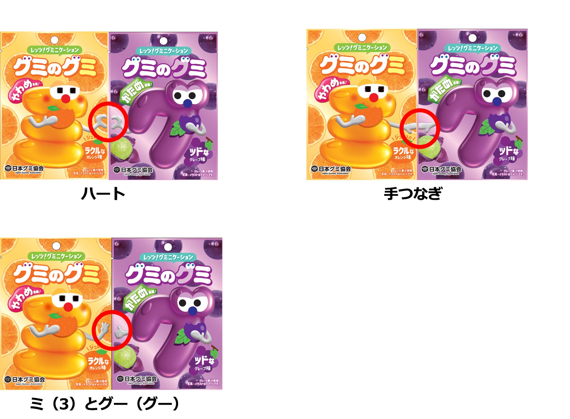 また、それぞれのパッケージには「グ」と「ミ」の文字が大きく大胆に描かれています。デザインは3種類あり、好きなデザインを組み合わせて楽しむのもおすすめ!