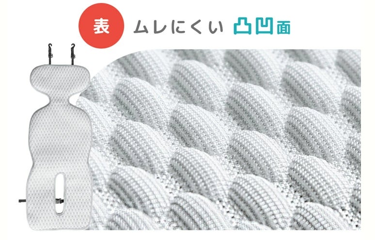 結晶化した“PCM素材”は硬くなってしまうというのが唯一の欠点でしたが、本製品はマスを多く設けることにより曲がりやすく、身体にフィットしやすい構造にしております。これにより偏りなく、ひんやり感を体感することができベビーカーの乗り心地も損なうことなく、より快適なベビーカーにすることが可能となりました。