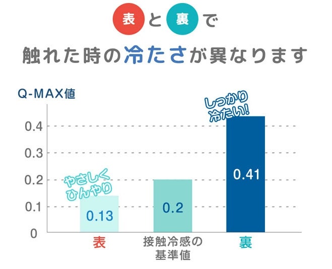 また、表面と裏面ではひんやりの感じ方が異なります。これは触れた時の冷たさを示すQ-max値で表すことが可能です。Q-max値とは繊維製品に触れた時、どれくらい冷たく感じるのかを示す値で、数値が大きいほど、ひんやり感が強い生地となっています。「生地そのものが冷たい」のではなく、「肌から生地に移動する熱の量が多い」ため、多くの熱が身体から奪われ冷たさを感じることができます。実際に表面はQ-max値が0.13、裏面は0.41と大きく数値が異なるため、その日の気温やご使用シーンに合わせて使い分けることができます。