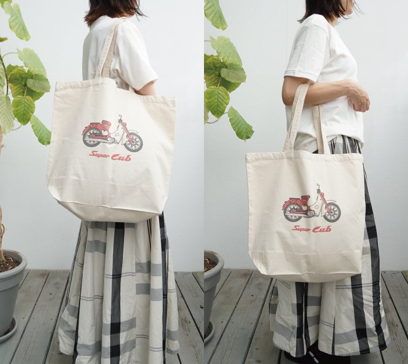 スーパーカブがゆるいタッチで描かれた少しレトロな雰囲気のトートバッグは、マチつきで大容量なので、エコバッグとしてはもちろん、レジャーやジム用バッグとしても使いやすいサイズ感です。A4サイズもそのまま出し入れすることができるので通勤・通学の普段使いやエコバッグ・ジムバッグとしても活躍します。