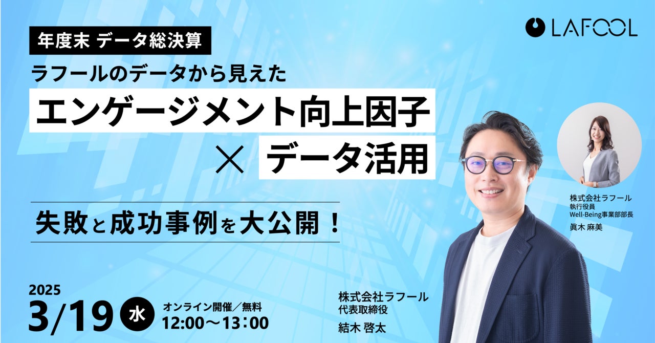 人的資本/ウェルビーイング経営支援の株式会社ラフール(本社:東京都中央区、代表取締役社⻑:結木啓太 以下「ラフール」)は、2025年3月19日(水)に「年度末 データ総決算:ラフールのデータから見えたエンゲージメント向上因子とデータ活用 ~失敗と成功事例を大公開!~」をテーマとしたセミナーを開催いたします。
