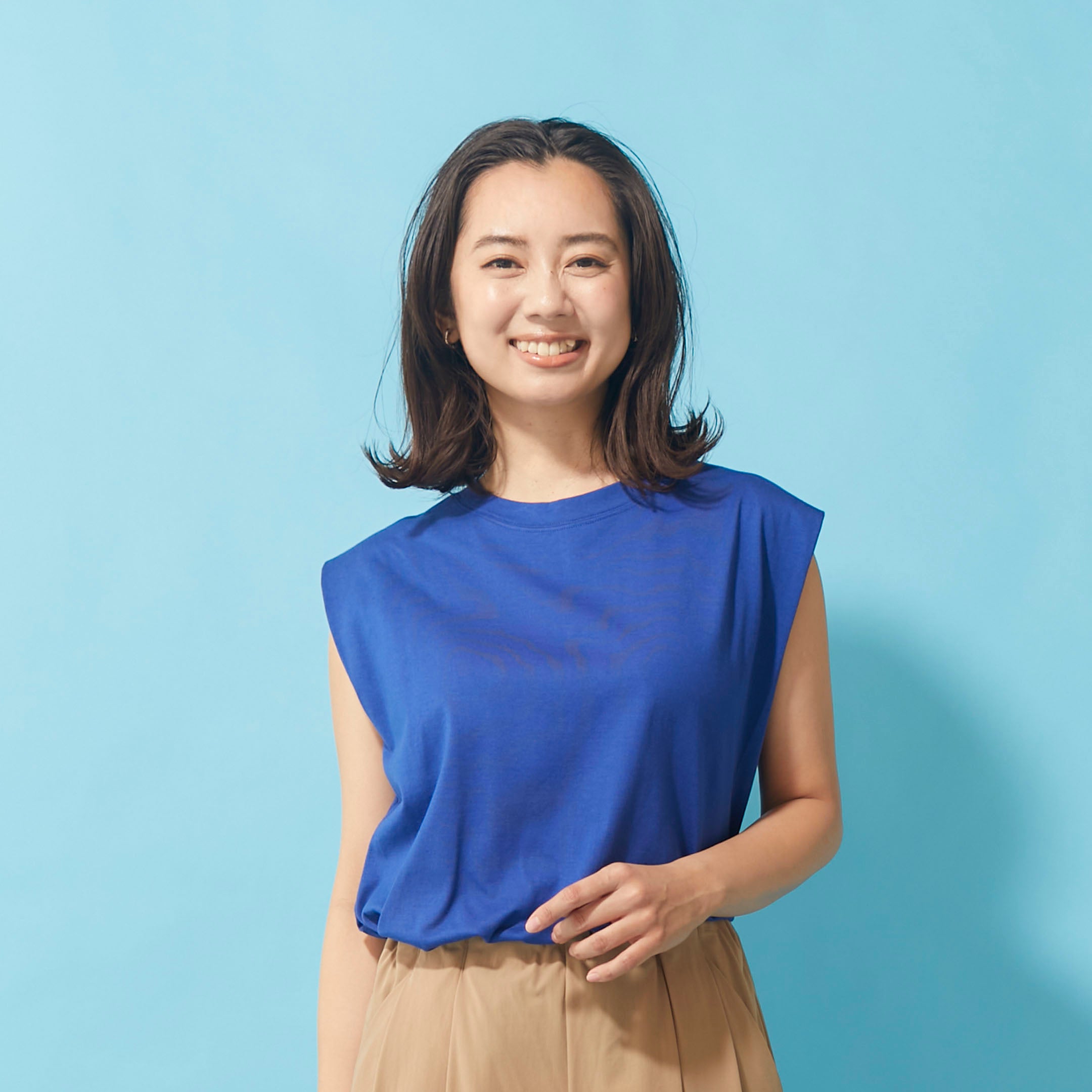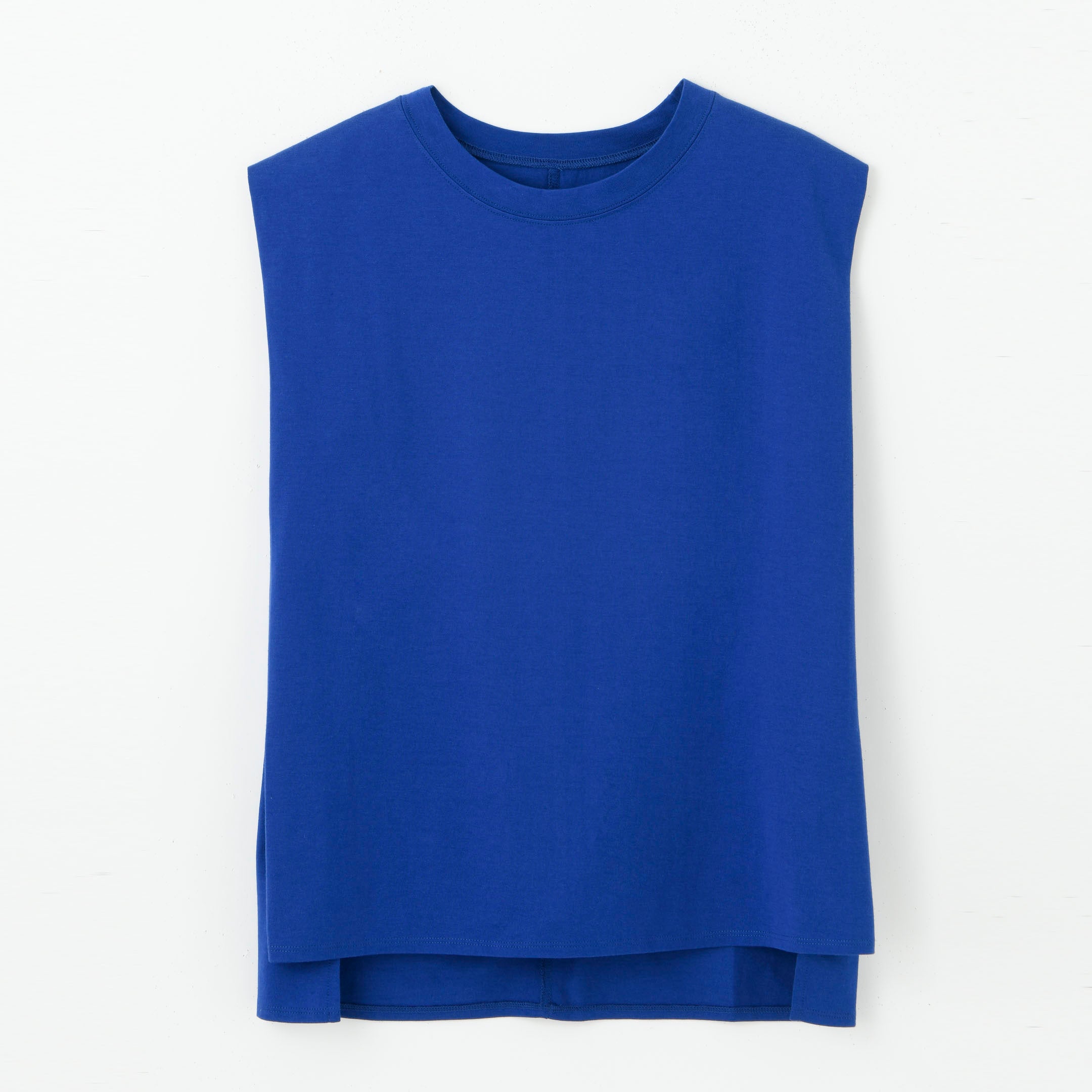 ゼロカーボン素材とオーガニックコットンを使用したノースリーブTシャツ。肌ざわりの良い滑らかな生地とやや詰まった襟で、1枚でも上品に決まります。袖のタックデザインが二の腕をすっきり見せてくれるところもポイントです。