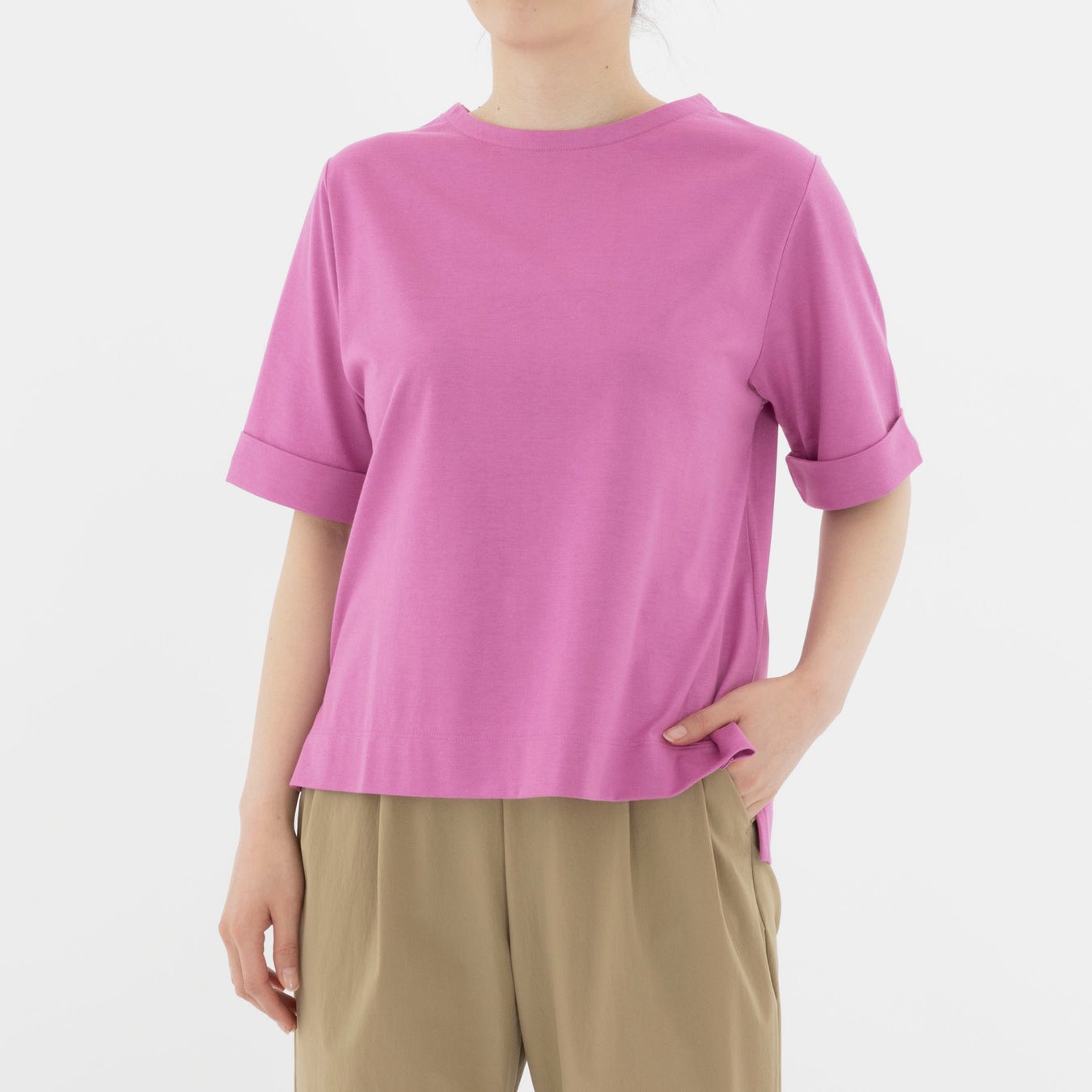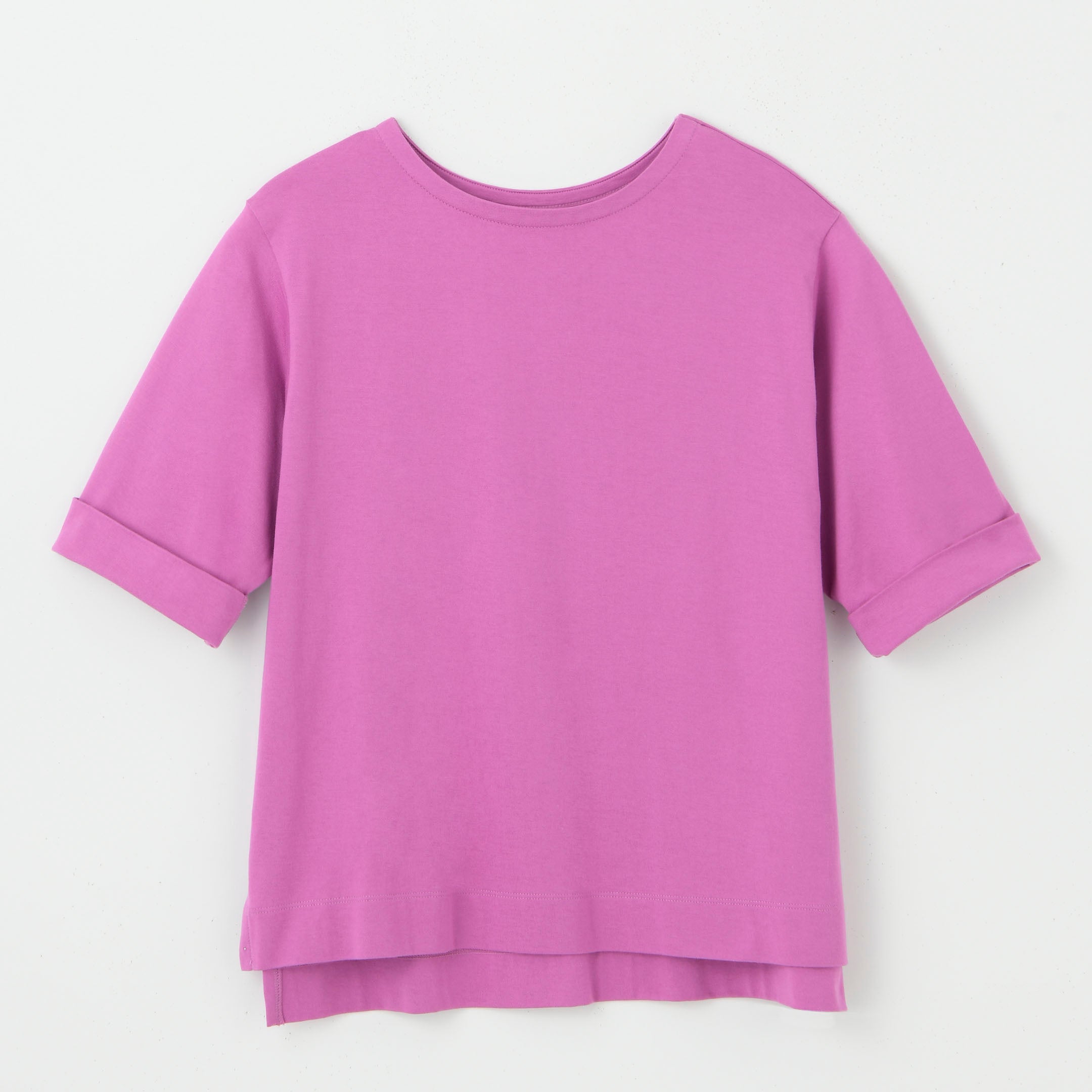 ゼロカーボン素材とオーガニックコットンを使用した5分袖Tシャツ。ゆとりのあるサイズで体型を拾いにくく、肌ざわりの良い滑らかな生地がデイリーウエアにぴったりです。