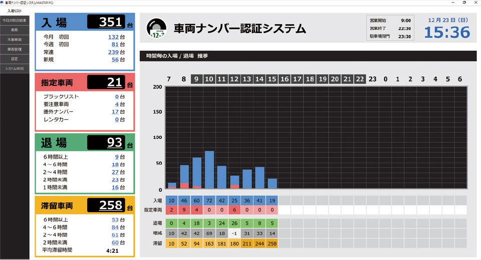 車両の入退場情報(時間帯・台数)を1画面で確認できるユーザーインターフェースにより、簡単に入退場状況が把握でき、滞留時間や利用時間、平均利用時間を統計化することができます。