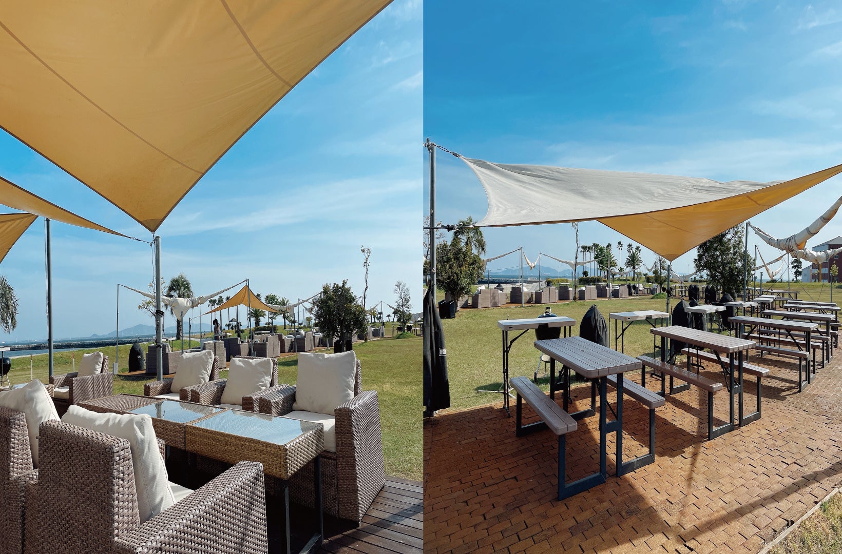 青空と海のコントラスト、夕日で燃える海の眩しさも、どちらの全天候型、都市型BBQでは楽しめない、アウトドアならではのお時間です。